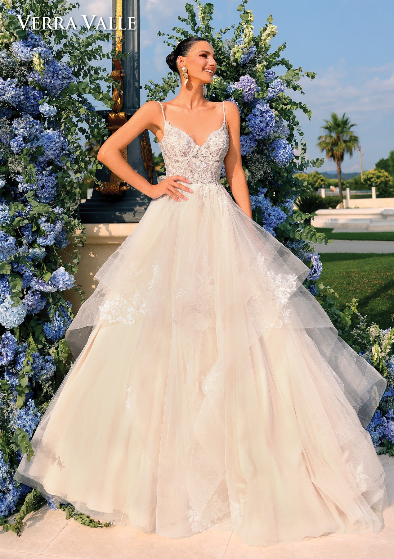 Experience timeless radiance on your wedding day with this beautiful and romantic Style #900339 dress. Beaded straps, lush lace bodice, and delightful tiered ruffle tulle and lace skirt come together to create a truly stunning bridal look. Glide down the aisle with a captivating, sweeping train that will make a lasting impression.