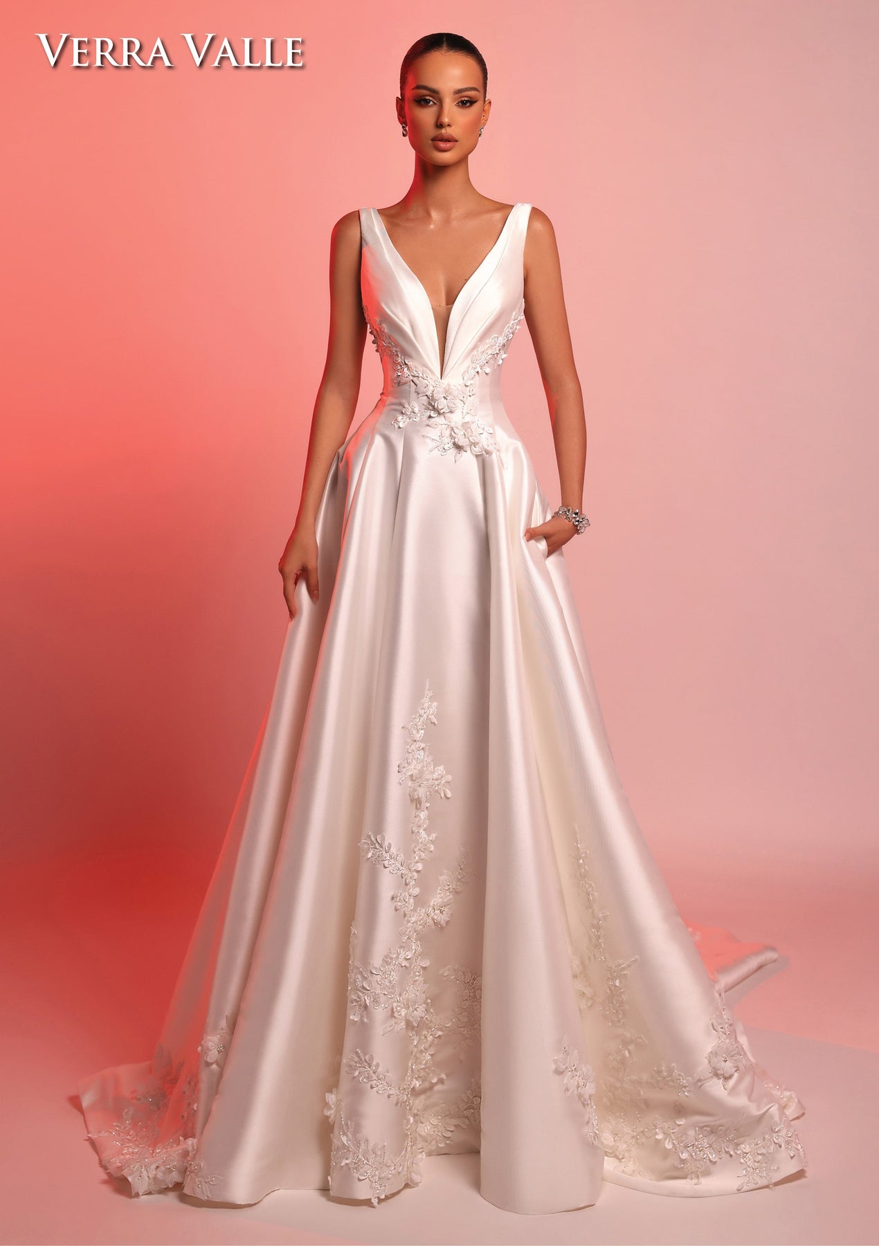 This stunning white wedding gown, style 900382, features intricate 3D flowers along the bodice, skirt, and back adding a touch of elegance to your special day. The radiant train completes the timeless look of this breathtaking dress. Be the star of your special day in this fabulous dress.