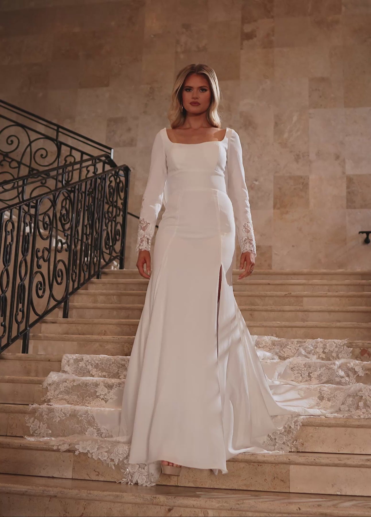 This Rachel Allan RB3206 crepe bridal gown combines sleek sophistication with a daring edge. Its bateau neckline and long sleeves offer a refined, modest look, while delicate lace appliqués on the sleeves add subtle intricacy. The form-fitting mermaid silhouette flares into a graceful lace-trimmed train, and a bold thigh-high slit reveals a striking glimpse of allure, perfect for a modern bride ready to captivate.