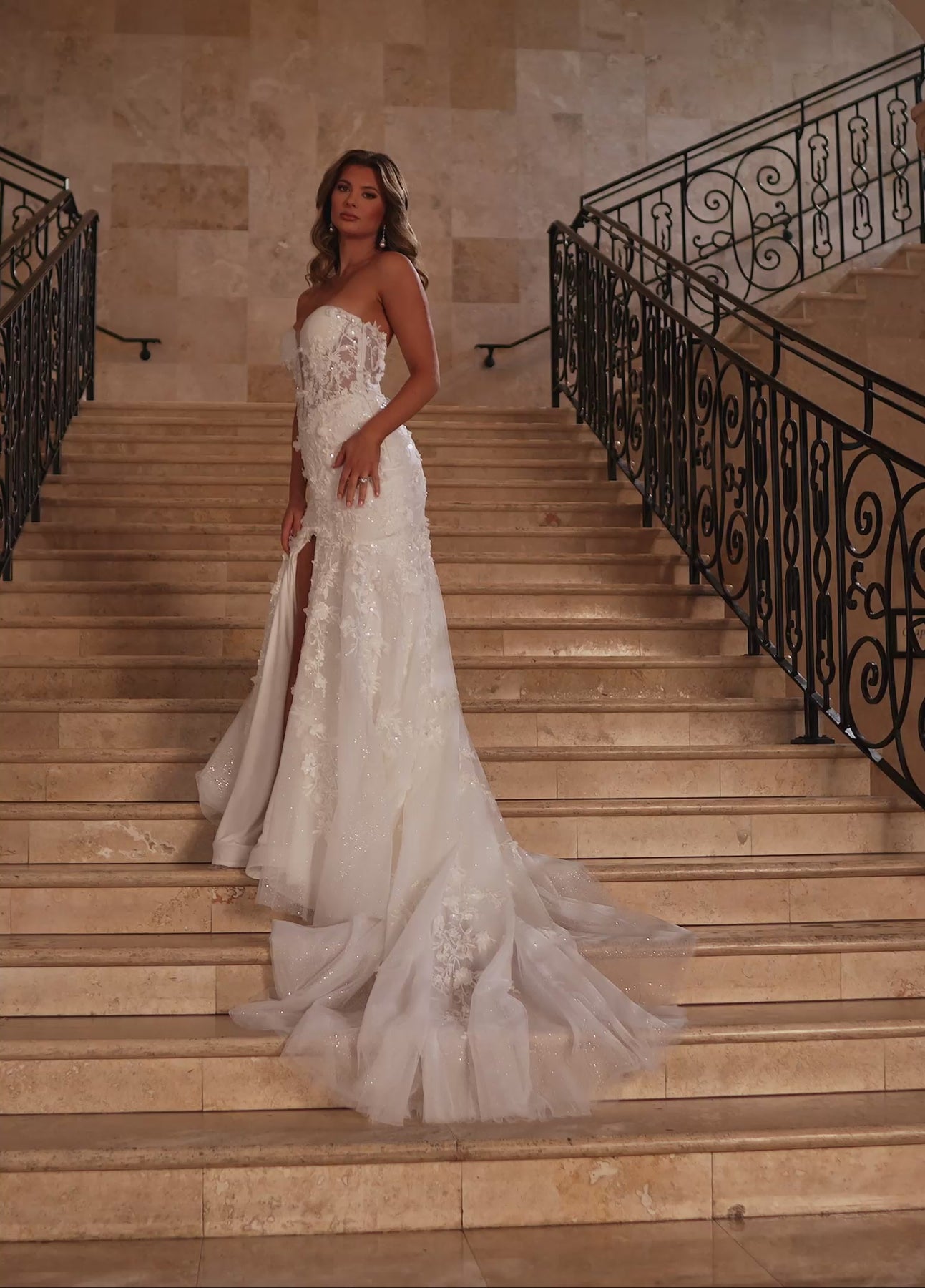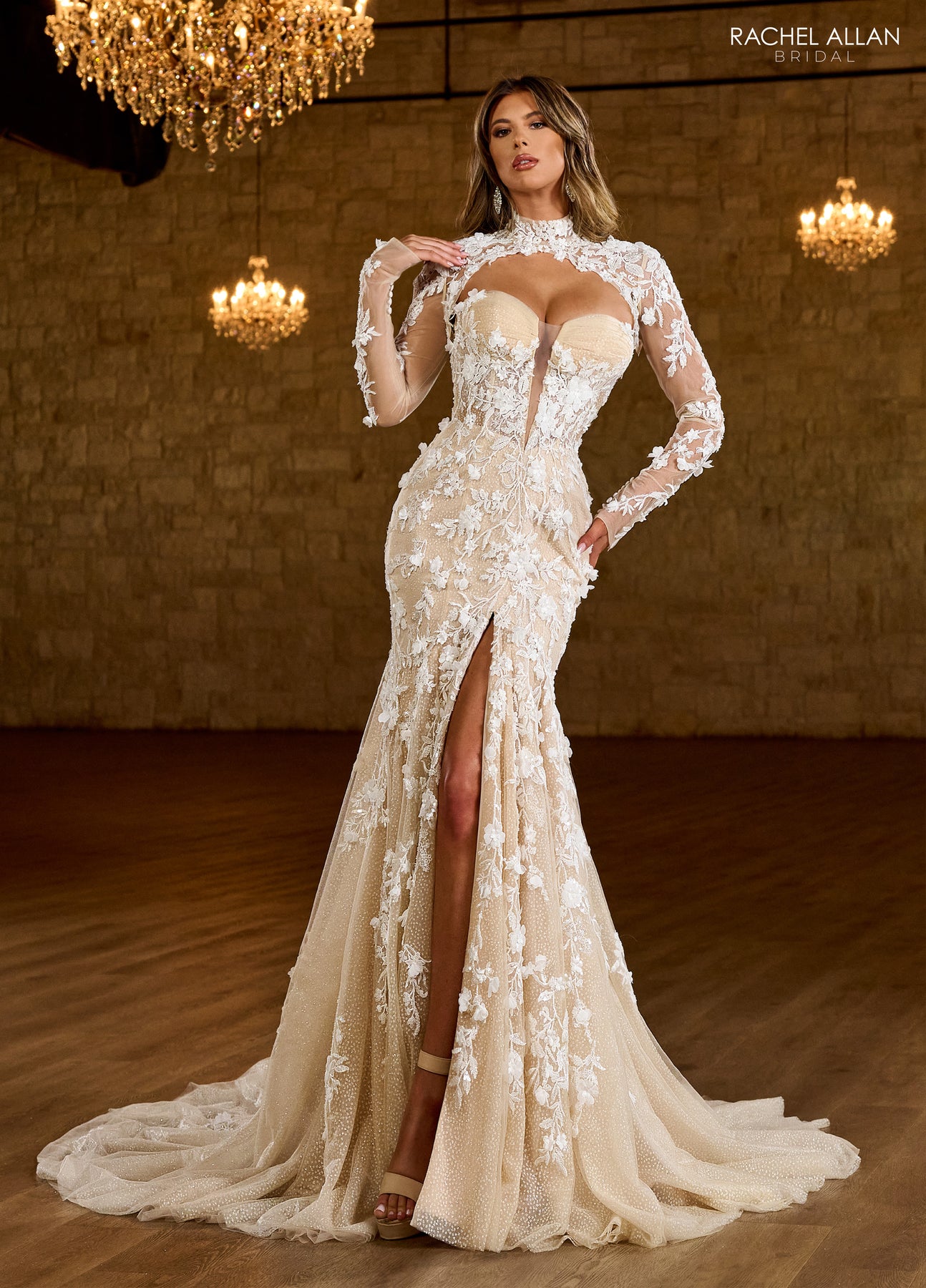 Step into the spotlight with the Rachel Allan RB5065 Dress, where bold meets beautiful. This gown’s striking silhouette and detailed floral lace overlay turn heads, while the daring high slit adds a playful twist. The fitted bodice flaunts a deep sweetheart neckline beneath sheer lace for a flirty illusion effect. Sheer, detachable long sleeves and an expansive train complete this show-stopping look—perfect for brides ready to dance the night away and steal every scene.