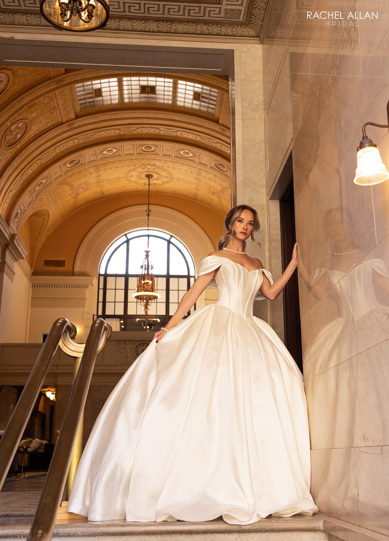 Step into your fairytale with the Rachel Allan RB6162 Dress, an off-the-shoulder ball gown that’s pure magic. Made from rich mikado fabric, it boasts a structured bodice and a full, pleated skirt that twirls like a dream. Ivory or white, your choice! The dainty buttons down the back add a touch of royal charm, making you feel like the princess of the day. Ready to steal the spotlight and dance the night away? This gown is your perfect partner in crime for a truly unforgettable entrance.