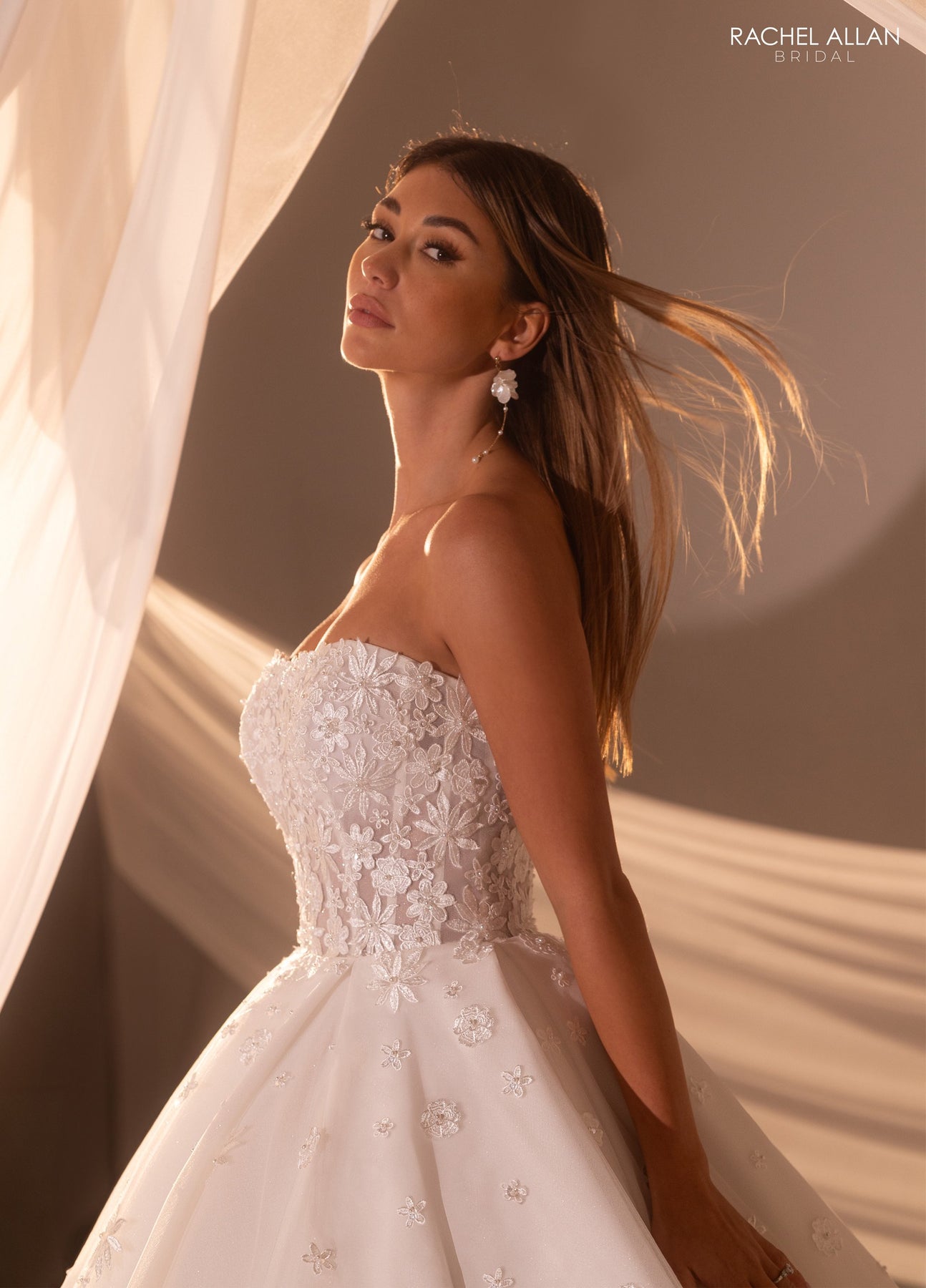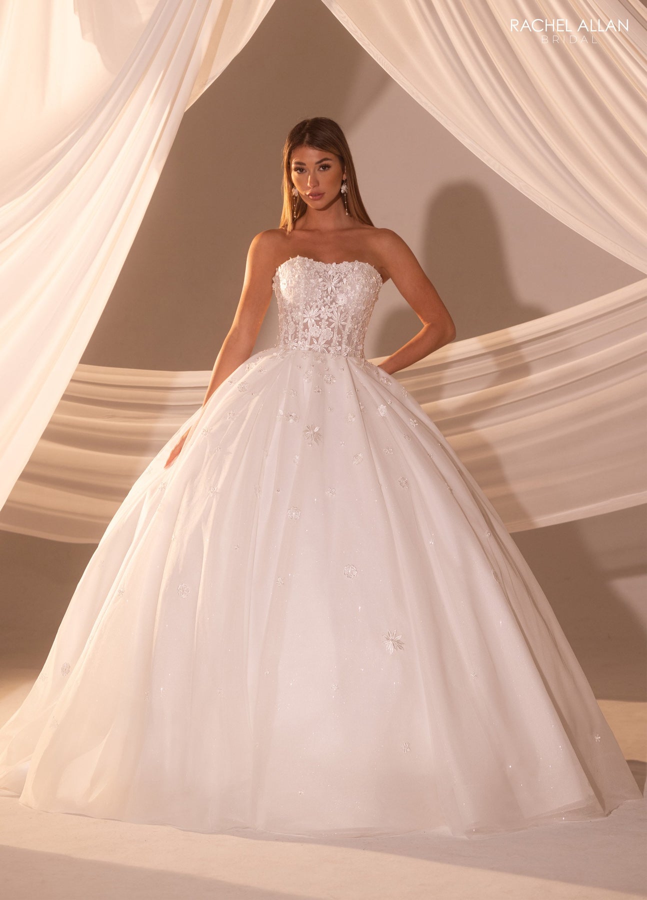 Step into your own fairytale with the Rachel Allan RB6178 Dress, shimmering in layers of glitter tulle sprinkled with delicate floral appliqué and sparkling beads. The strapless bodice flirts with romance, while the full ball gown skirt promises show-stopping elegance. Available in Ivory or White, with a detachable bodice liner to keep you comfy as you dance the night away. Perfect for brides who want to sparkle with every step!