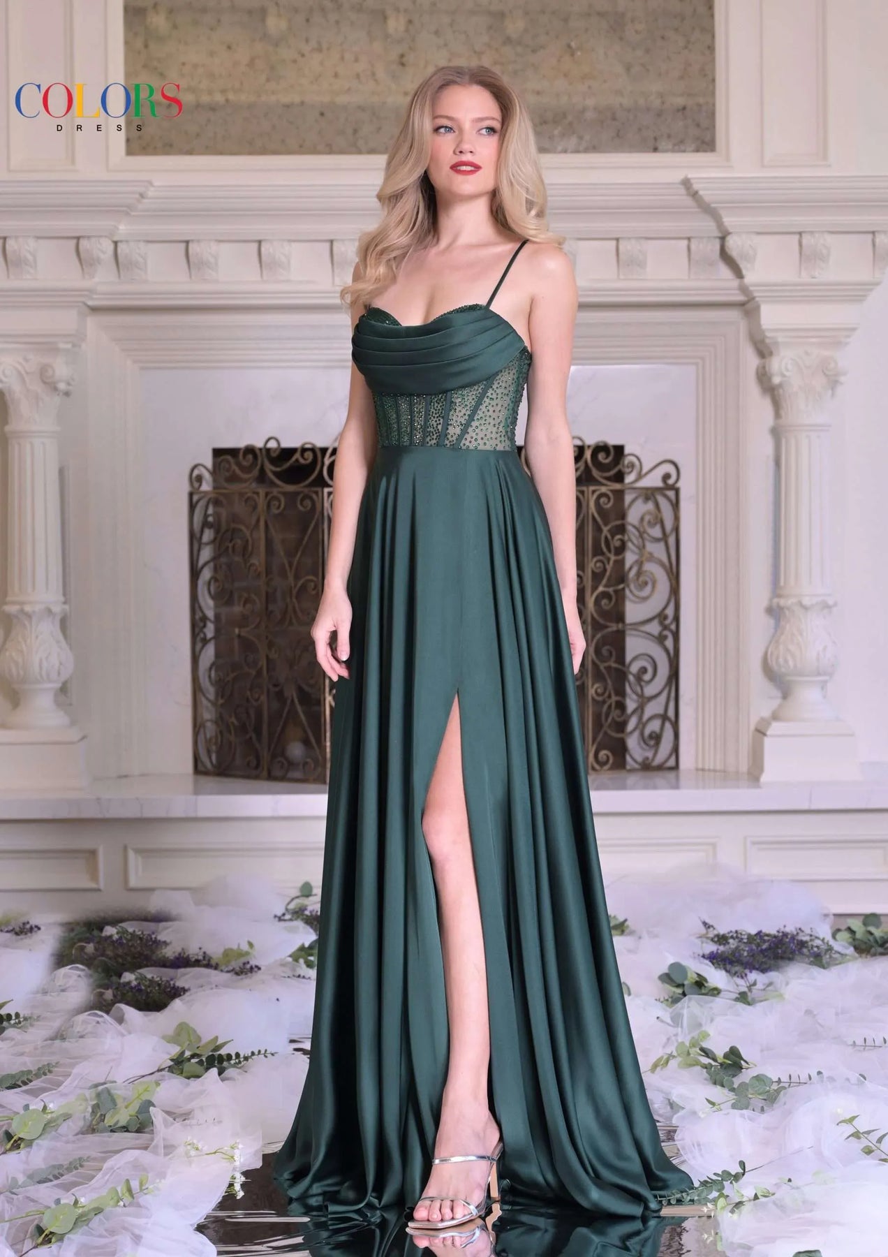 Turn heads in this quirky, yet elegant Colors 3431 Dress. The satin A-line gown features a sheer corset heat stone bodice and a drape neckline. With a skirt slit, this dress adds a touch of fun to any formal occasion. Show off your playful style with this unique and eye-catching dress!