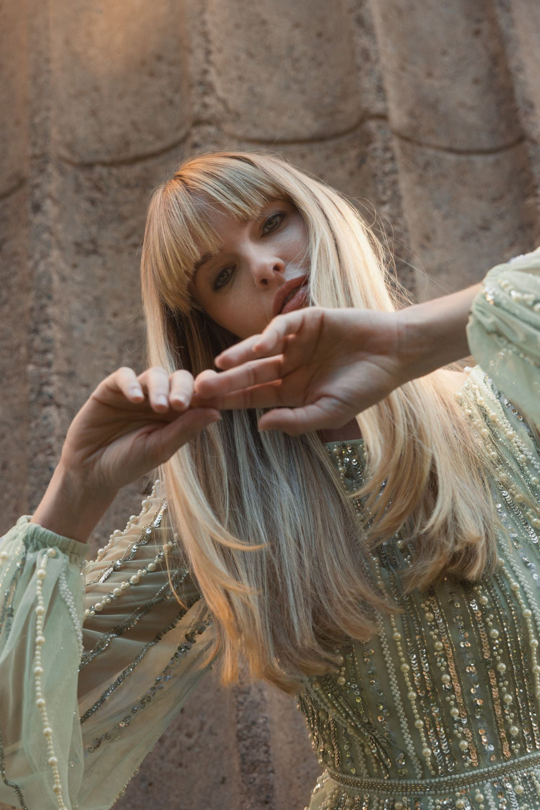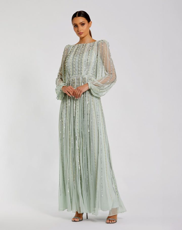 Indulge in opulent elegance with this hand-embellished gown. This stunning creation features a hand-beaded and pearl embellished sequin overlay and is enhanced with romantic sheer bishop sleeves and intricate striped pearl and sequin detailing.