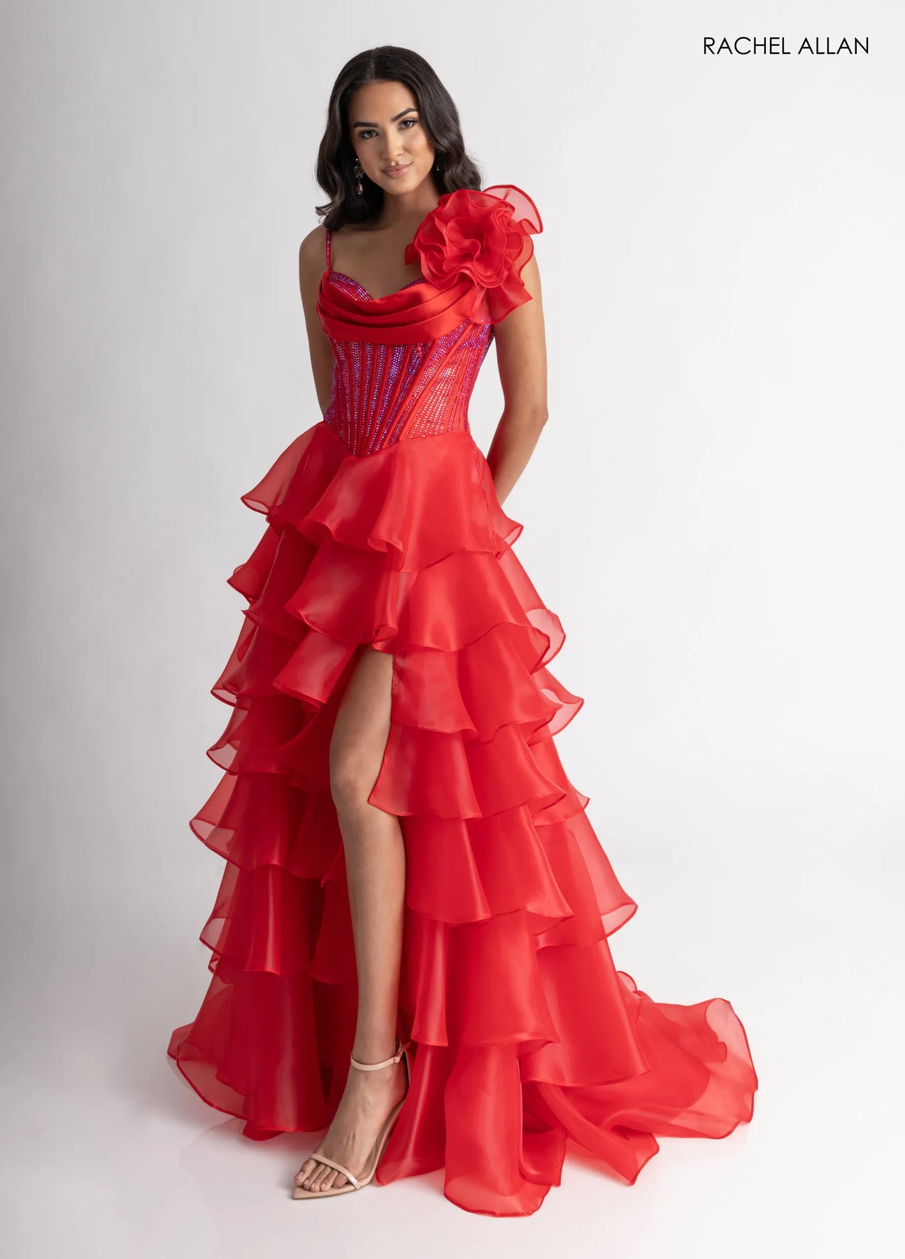 Command attention in this stunning Rachel Allan gown featuring a beaded corset bodice that sculpts and supports your silhouette. Luxurious tiered organza creates an enchanting high-low hemline with dimensional 3D florals at the shoulder, while voluminous ruffles add movement and drama. Built on a stretch satin foundation for comfort and confidence, this dress empowers you to shine at prom, pageants, and unforgettable celebrations. You deserve to feel as radiant as you look.