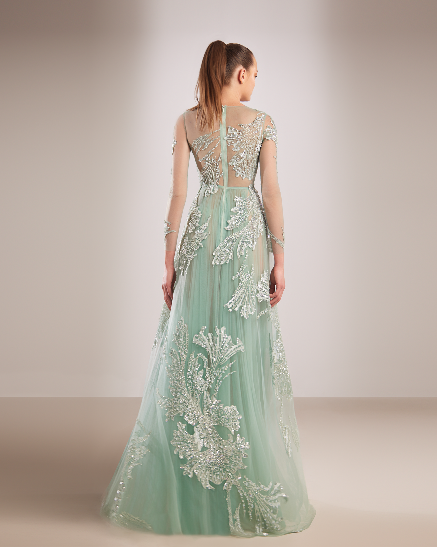 Elevate your wardrobe with the Reverie Couture FW218 Dress. This exquisite sage green gown features a flowing A-line skirt that creates an enchanting silhouette. The sheer illusion neckline and sleeves are adorned with intricate embroidery, adding a touch of elegance to any occasion. A must-have for any fashion-forward individual.