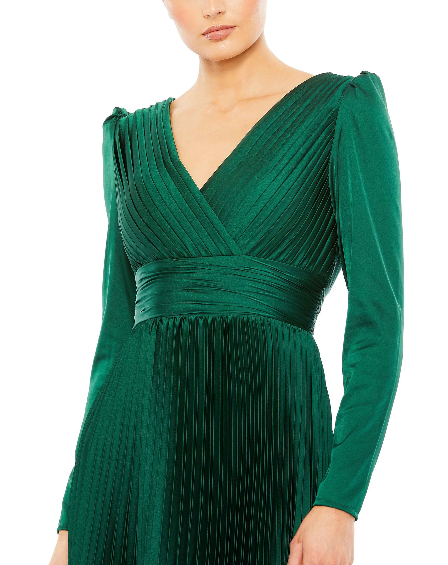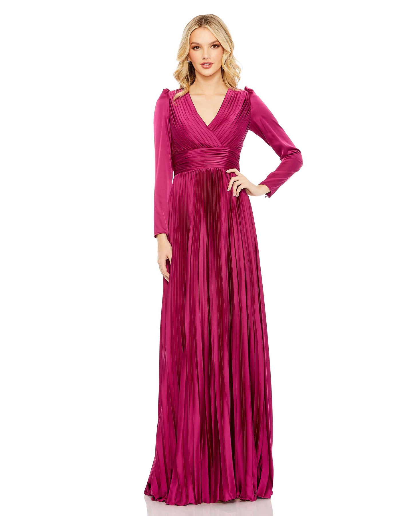 Chic faux-wrap satin gown with puffed shoulders, a v-neckline with a pleated bodice and a full-length pleated skirt.