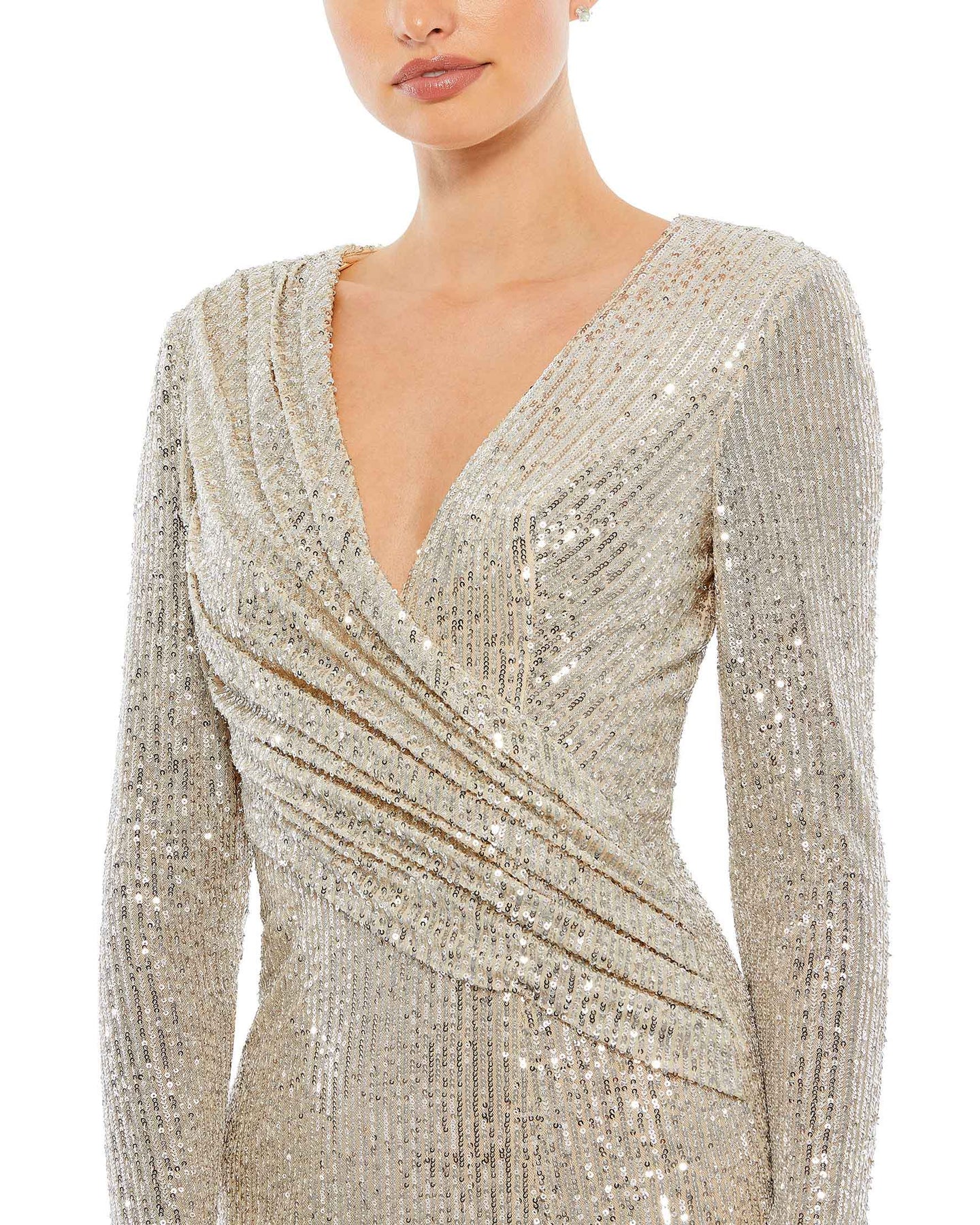 - Fully lined through bodice and skirt; semi-sheer unlined sleeves