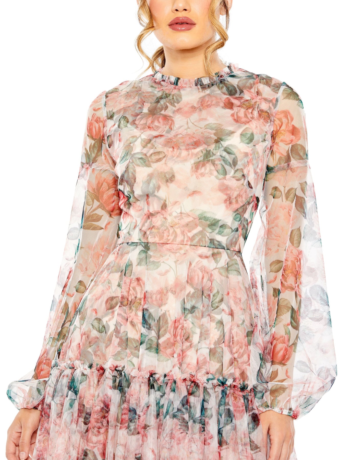 This dress boasts a high neckline and long balloon sleeves, adding sophistication to your look. With its delicate floral print on chiffon fabric, it brings a touch of romance to any occasion. Perfect for special events or garden parties, this midi dress ensures you'll stand out.