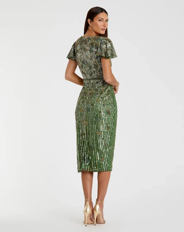 Introducing our Embellished Faux Wrap Flutter Sleeve Dress, designed for effortless charm. Adorned with delicate embellishments and featuring flutter sleeves, this dress offers a flattering faux wrap silhouette. Perfect for various occasions, it combines style and comfort seamlessly, ensuring you shine with every step.