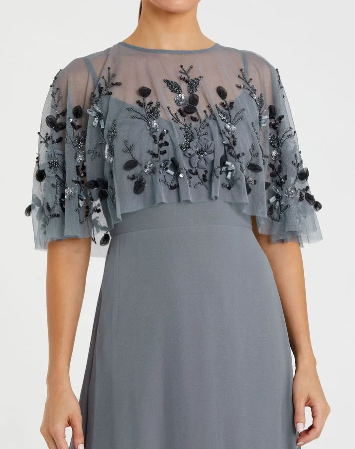 • Embroidered cape accented by hand-stitched sequins