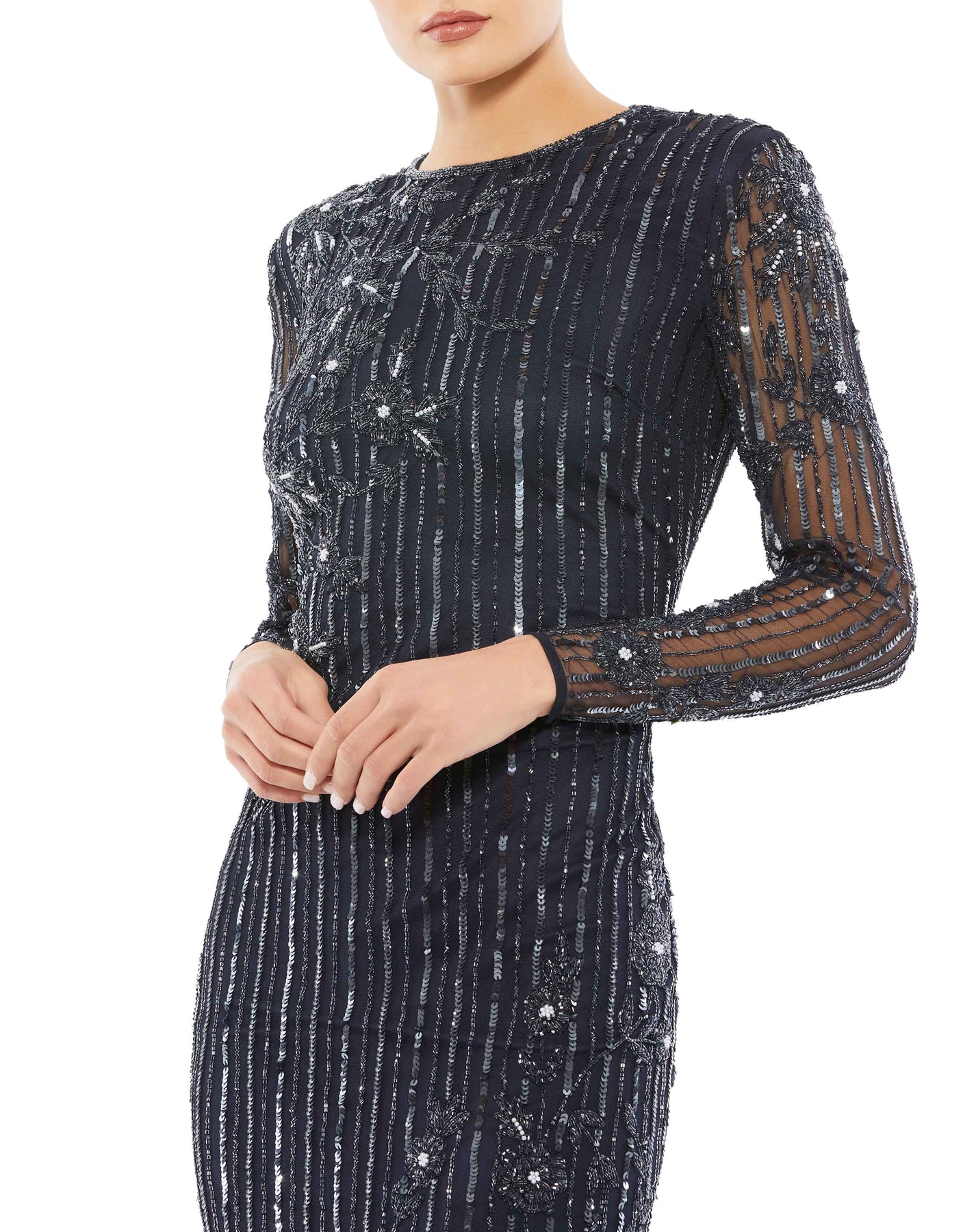 Embellished High Neck Illusion Long Sleeve Gown