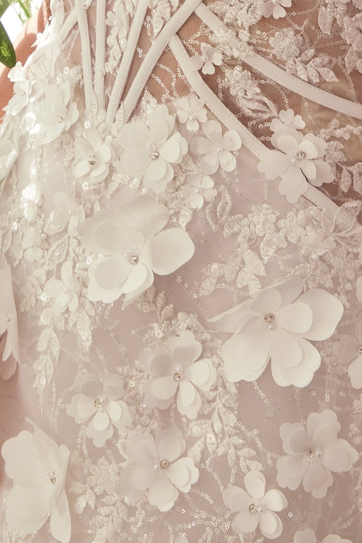 - Design: Strapless sweetheart neckline, sheer bodice & dimensional applique skirt