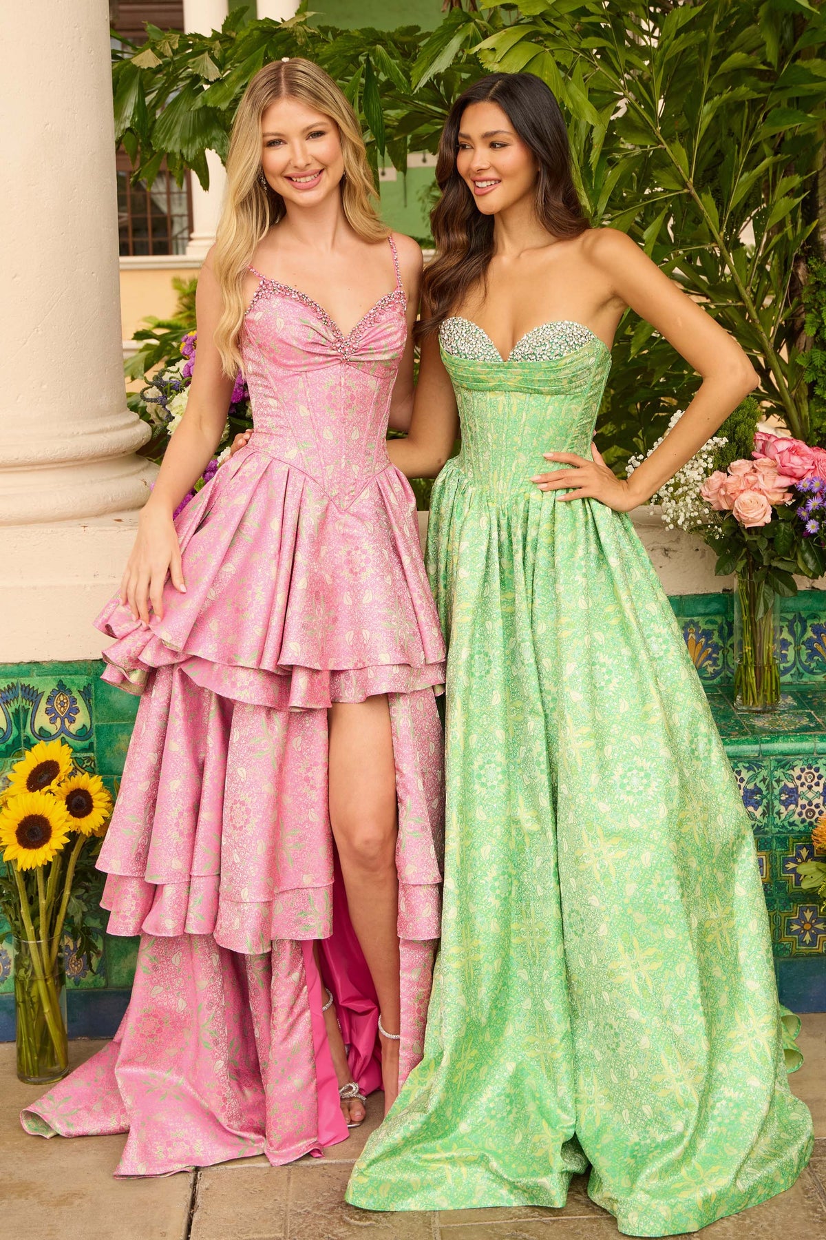 Ava Presley 42318 makes a statement with its luxurious metallic jacquard fabric and bold thigh-high slit, blending elegance with runway-inspired edge. The fitted bodice with sweetheart neckline and detailed beading draws attention to the waist, while the full skirt adds grandeur and volume. This is the ultimate gown for a standout prom night or gala appearance.
