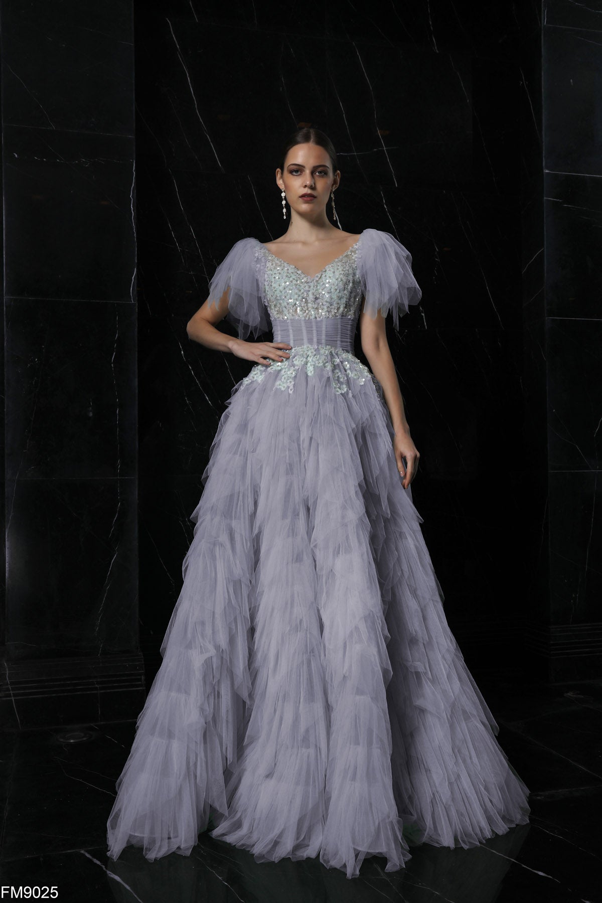 The AZZURE FM9025 dress exudes elegance with its fitted, beaded design and V-neckline. The V-backline and short sleeves add a touch of sophistication. The cascading fringed detailing creates a striking ball gown silhouette, perfect for prom or as a mother of the bride dress. A true couture piece for any formal occasion.