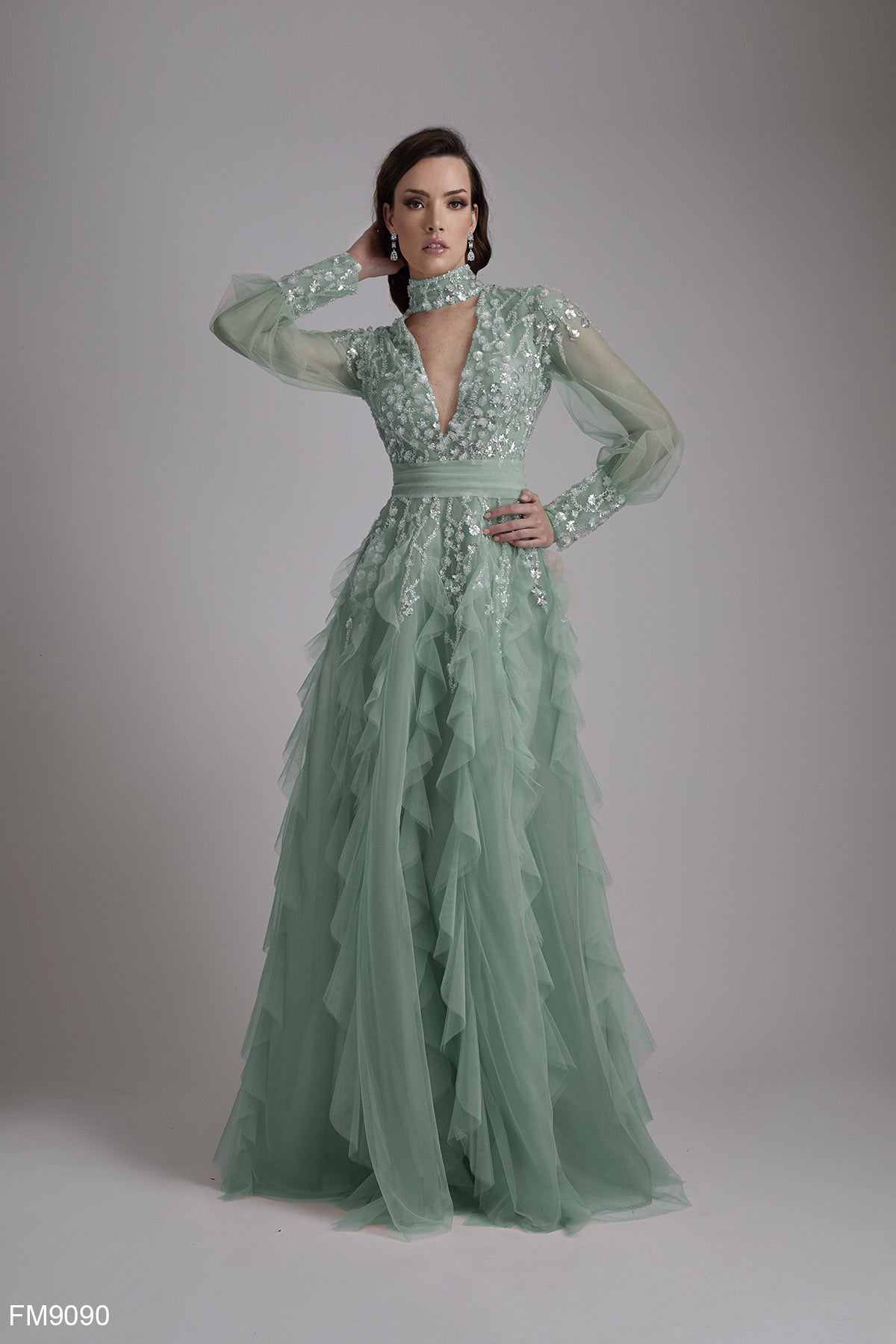 Expertly crafted, the AZZURE COUTURE FM9090 Dress features sheer puff long sleeves, a flattering v neckline and backline. Adorned with beaded detailing that resembles a necklace, this dress radiates elegance. The cascading ruffles skirt adds texture and movement, perfect for prom, evening events, or as a mother of the bride dress.
