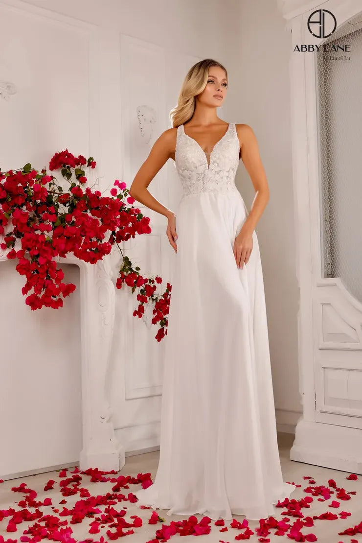 Say "yes" to the Abby Lane 97137 Dress, a captivating bridal gown designed for the modern bride who dares to be different. This exquisite long dress seamlessly blends delicate lace with ethereal chiffon, creating a luxurious fabric that moves beautifully with every step. The elegant V-neckline and sleeveless cut offer a refined silhouette, while the dramatic open back reveals an unexpected moment of sophistication and grace. Every detail has been thoughtfully crafted to make you feel like the best version of yourself on your wedding day. This is more than just a dress it's a statement of your unique style and confidence as you embark on your greatest adventure.