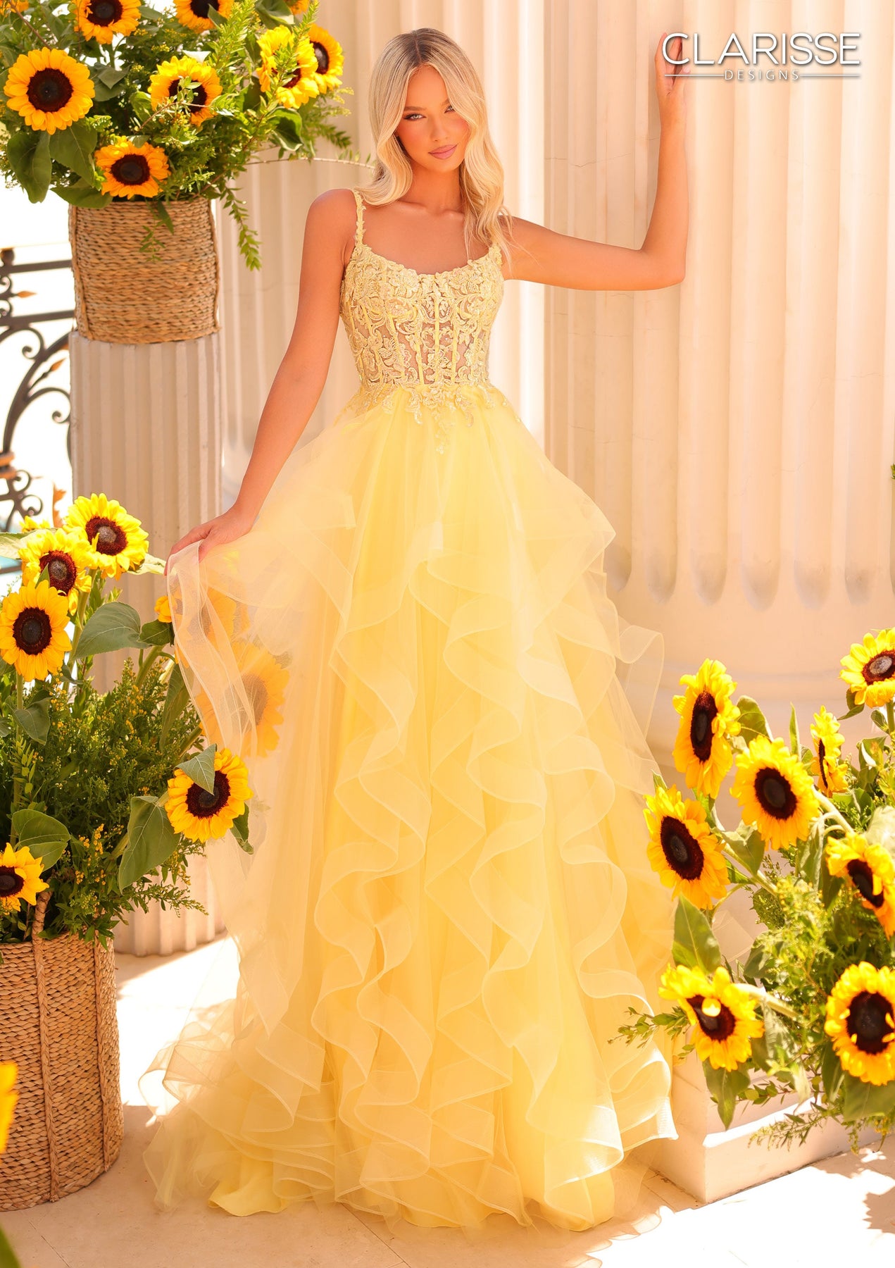 Add a pop of sunshine to your wardrobe with our Style 811191! This playful yellow dress exudes summer vibes with its flirty ruffles and lace-up flirty and fun back, perfect for any occasion. Get ready to turn heads and have some fun in the sun!