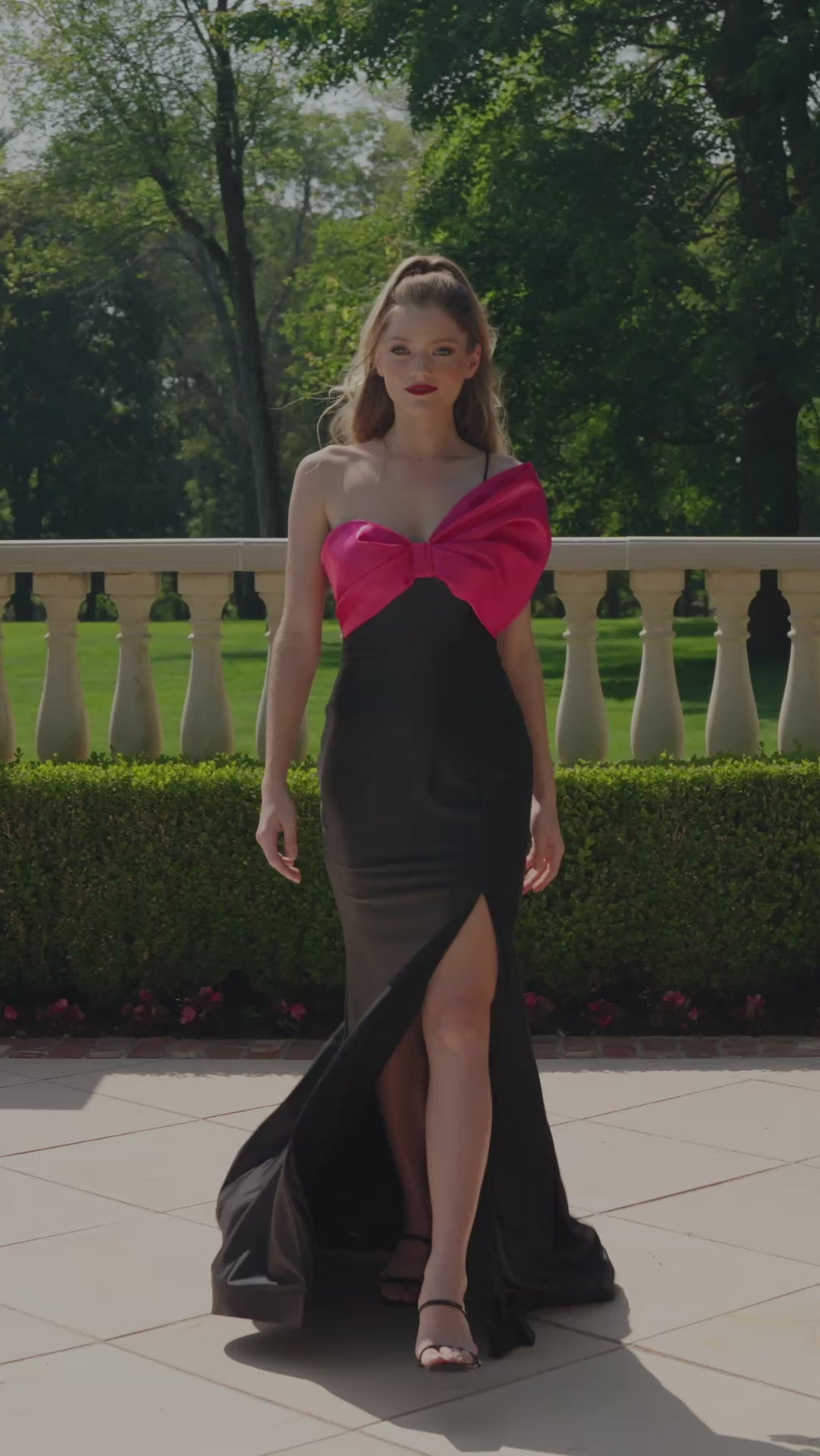 Elevate your elegance with the Colors 3714 Dress, featuring a figure-flattering fit and flare silhouette that effortlessly enhances your shape. The sleek slit skirt adds a touch of allure, while the bold asymmetrical mirrored organza bow creates a stunning focal point. Perfect for making a confident statement at any special occasion.
