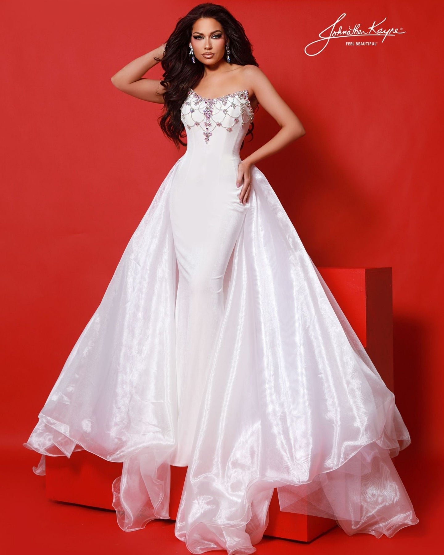Step into the spotlight with the Johnathan Kayne 2945 Dress! This playful gown dazzles with a delicate overskirt that floats gracefully, adding a whimsical touch to your ensemble. The strapless cut highlights your shoulders, while sparkling beading brings just the right amount of shimmer to keep all eyes on you. Perfect for making unforgettable memories in style!