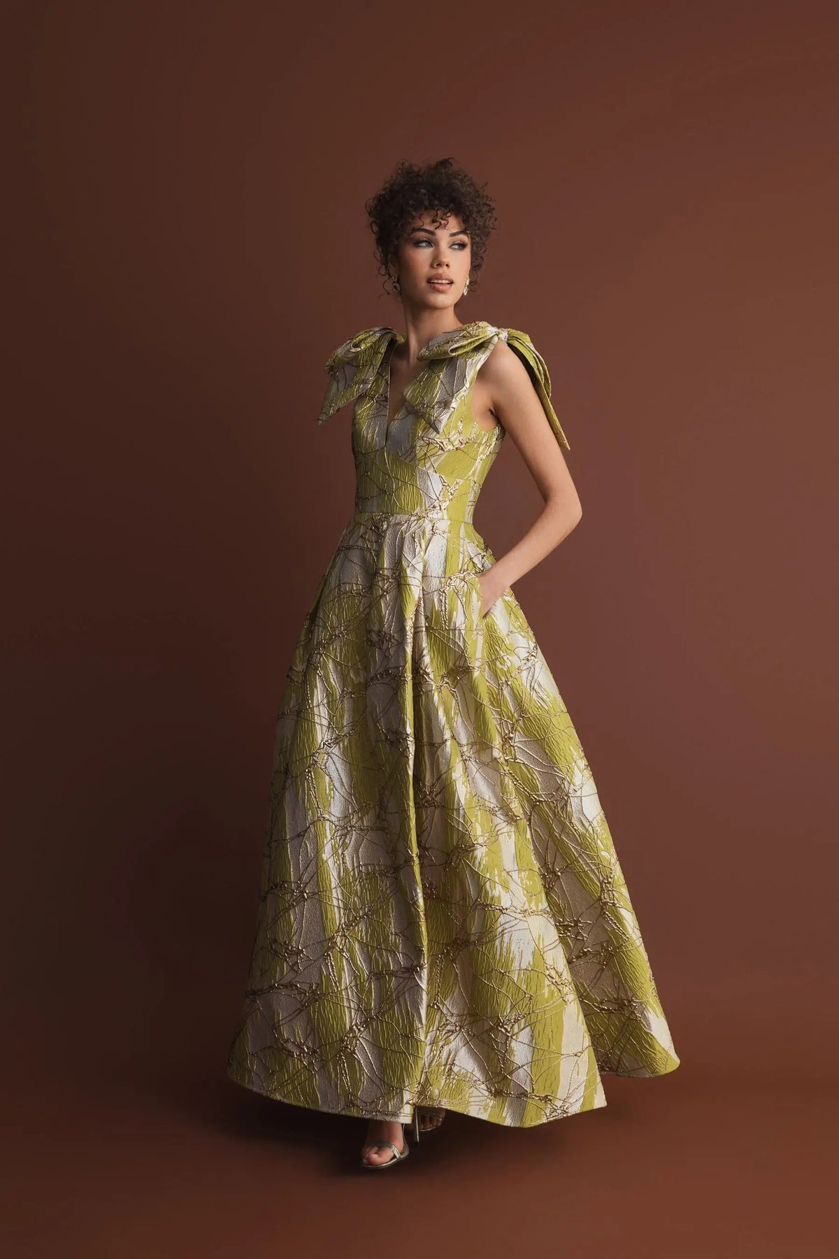 Make a grand entrance in this breathtaking gown. With its striking abstract metallic floral design, v-neckline, and dramatic sculptural shoulders, this gown is designed to leave a lasting impression.