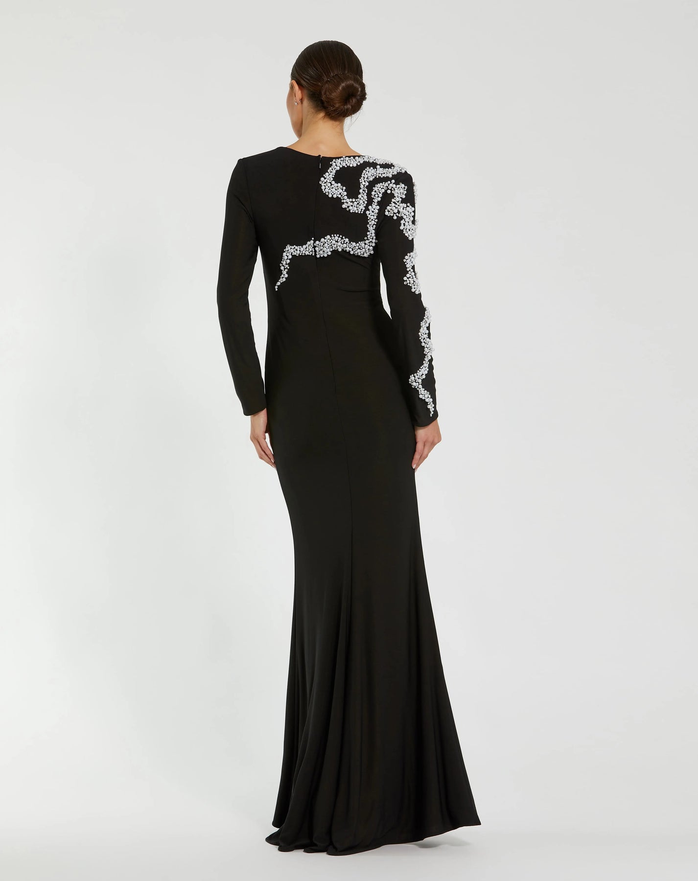 Sleek and modern, this black jersey dress features a fitted silhouette and long sleeves adorned with pearl and rhinestone swirls. A white beaded and pearled wave adds an abstract touch of high glamour; perfect for galas and evening affairs.