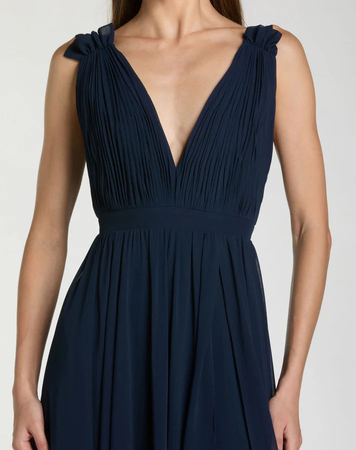 Ruched chiffon maxi dress with a plunging v-neckline and thigh high slit.
