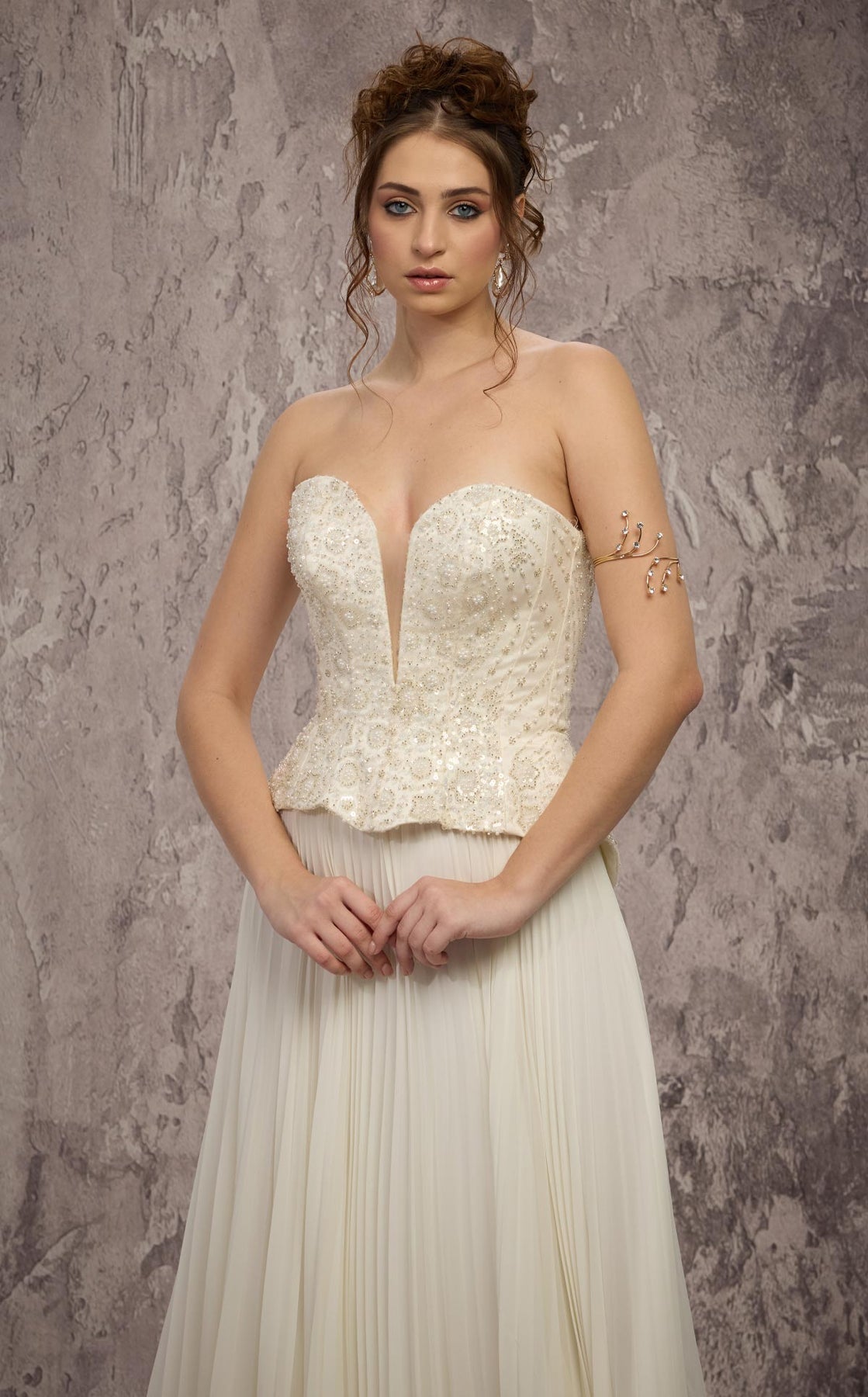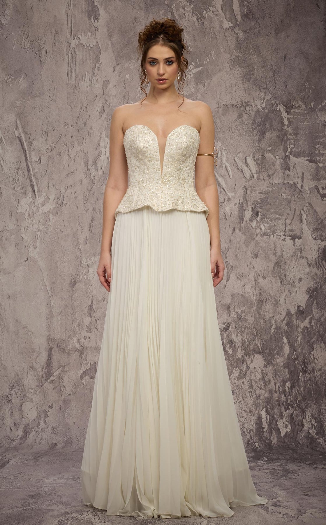 - Structure: Sculpted peplum bodice with tonal 3D beads, delicate embroidery, crystals, and beaded detailing