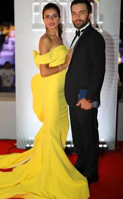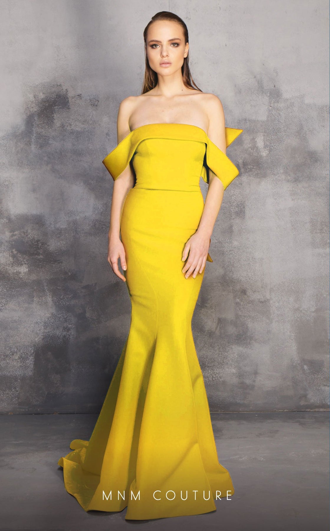Long mermaid dress with off the shoulder straight bustline with sleeves that connect to the back. This designer dress is constructed with a princess seam that follows the natural curves of the body which will compliment the wearer’s shape. The back has a structured ribbon like detail made of the same material and boning giving it a structured origami like look while below it is a dramatic flounce that opens up into a back slit making this piece a unique design.