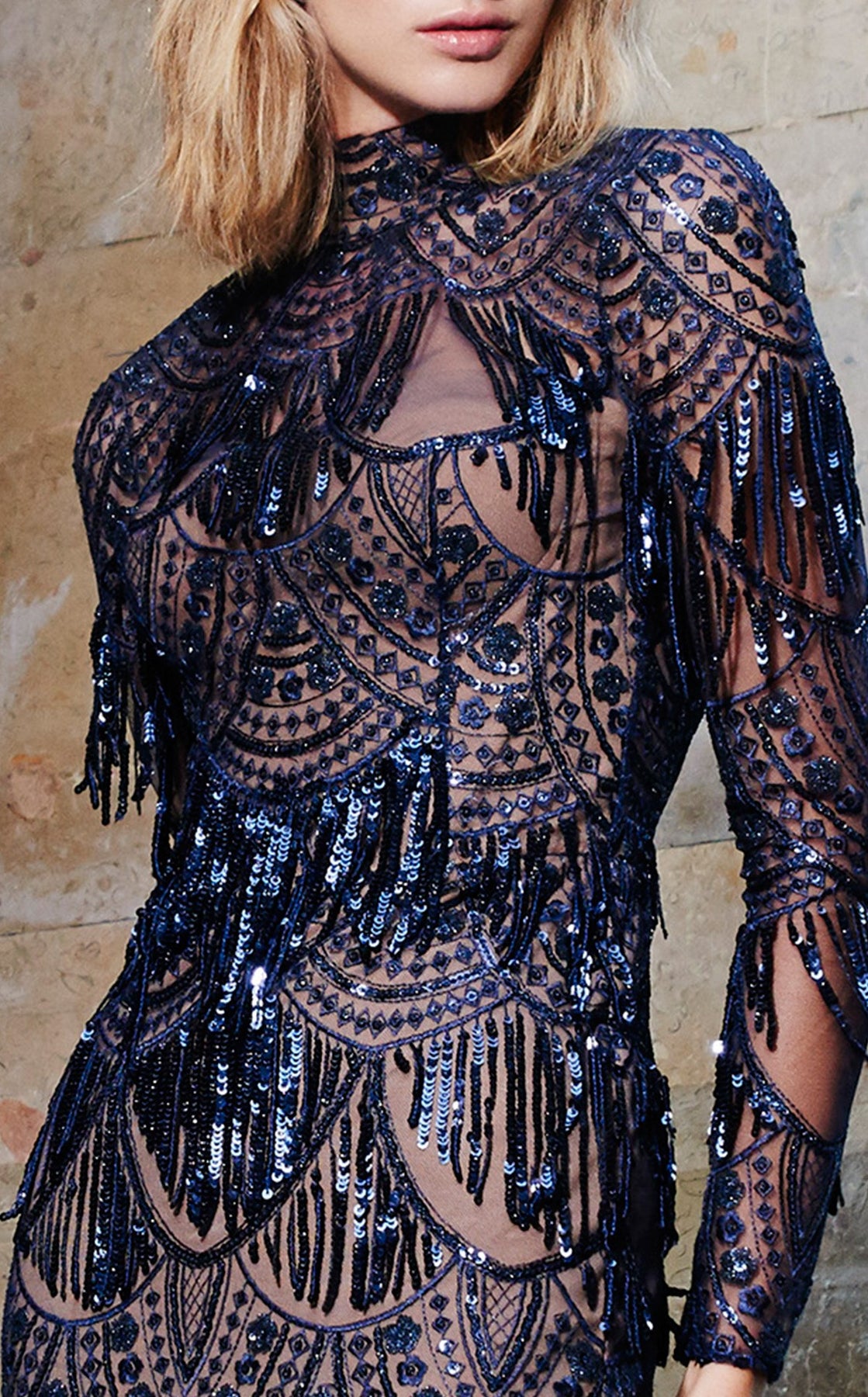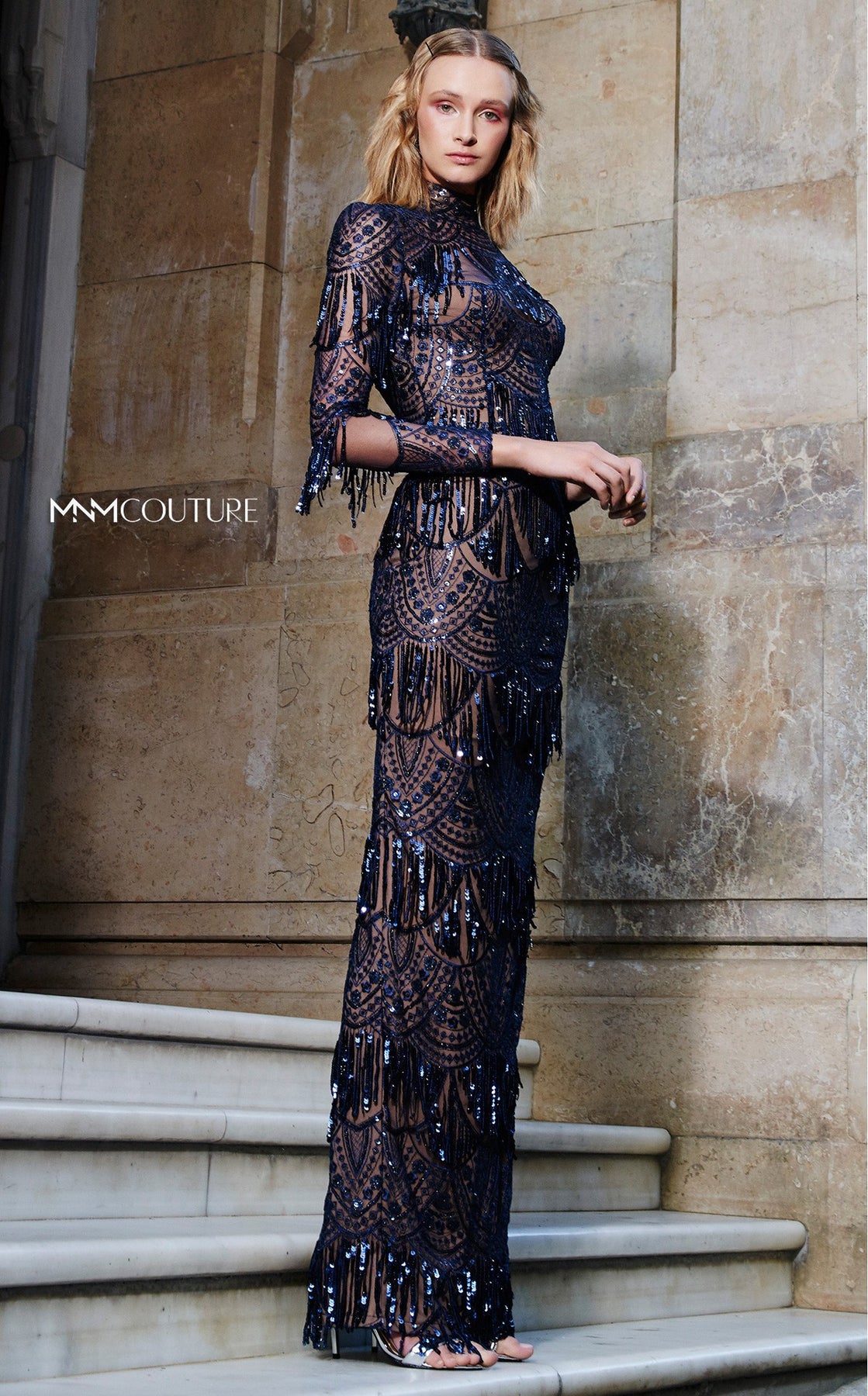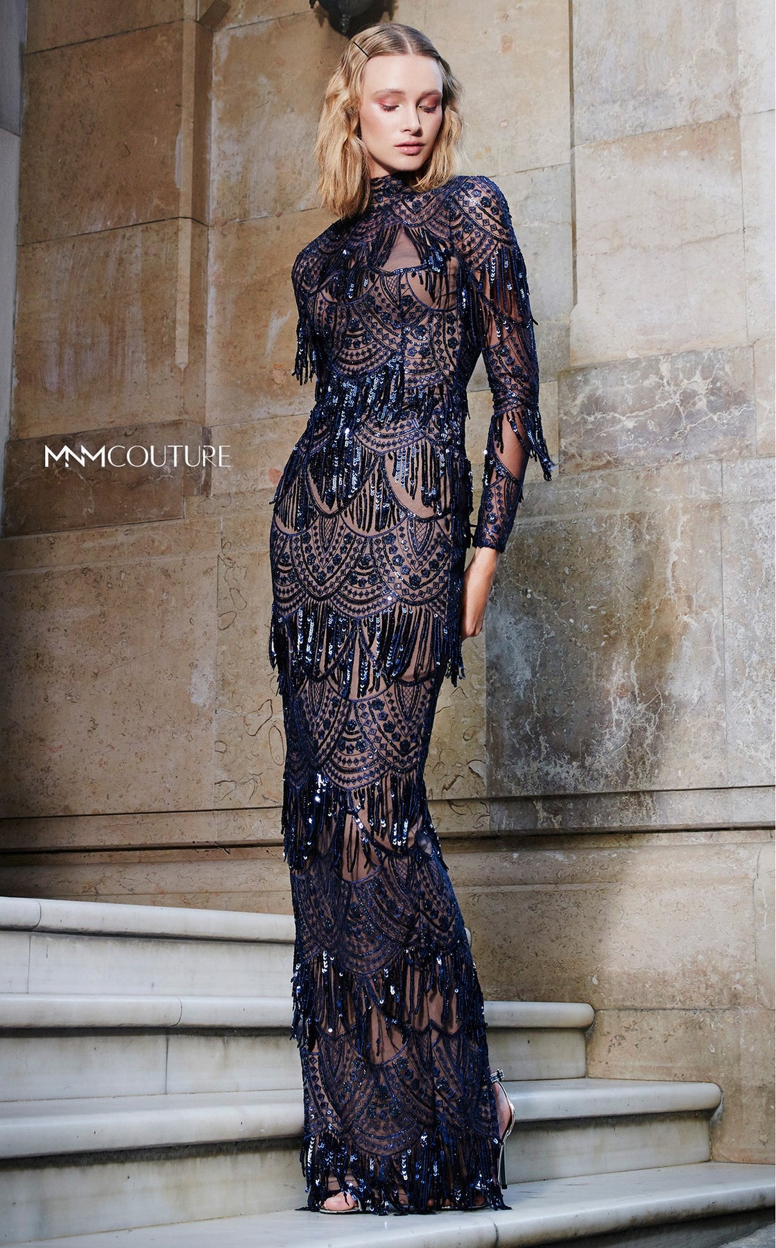 Fantastic long-sleeved formal with fringe detail by MNM Couture