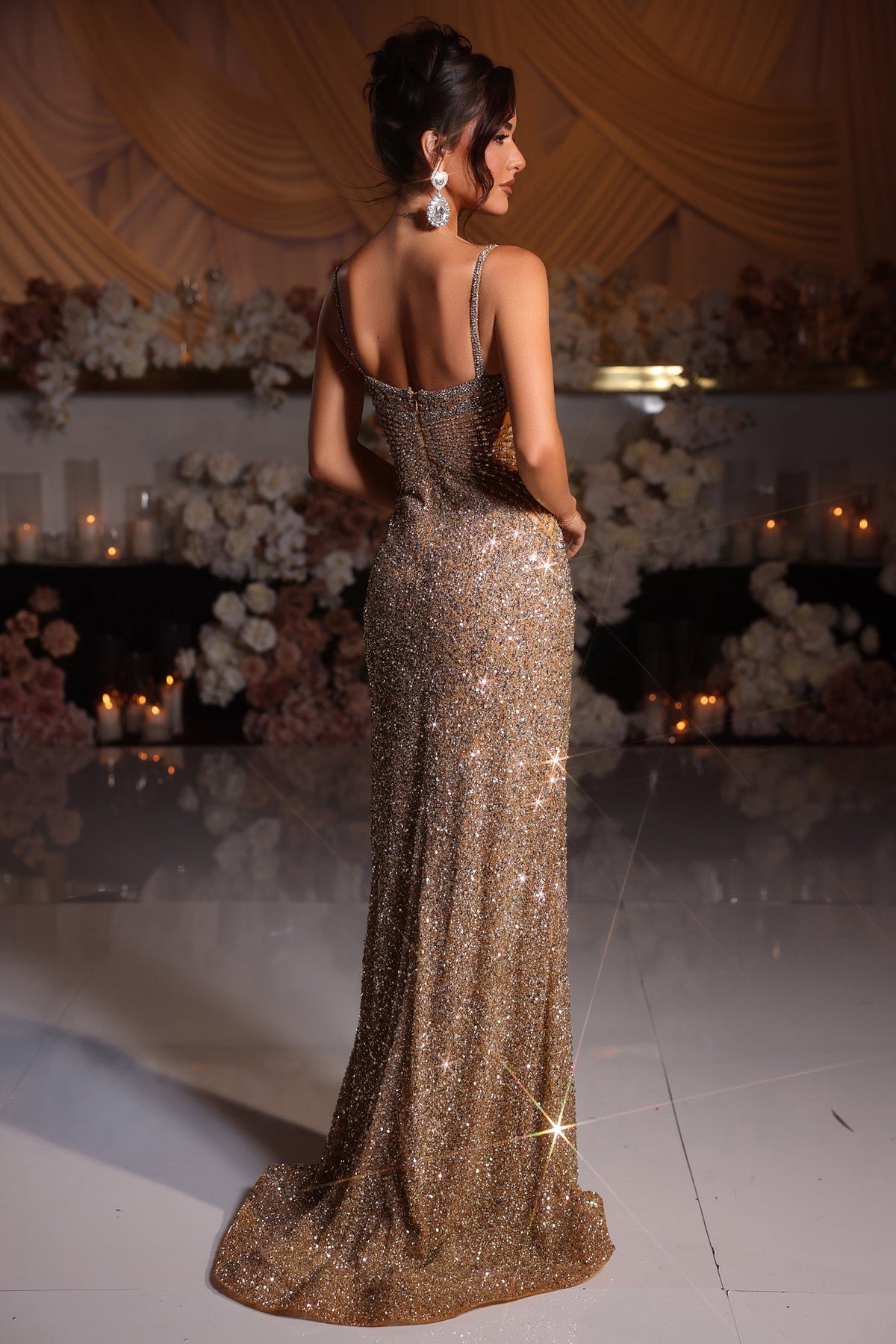 Turn heads effortlessly in this playful, elegant long dress. Designed with shimmering beads that catch the light beautifully, it features a flattering V-neck and slender straps framing a sleeveless silhouette. The daring high slit adds a flirty touch, while the open back keeps things cool and captivating. Perfect for making a cute yet sophisticated statement at any special occasion.
