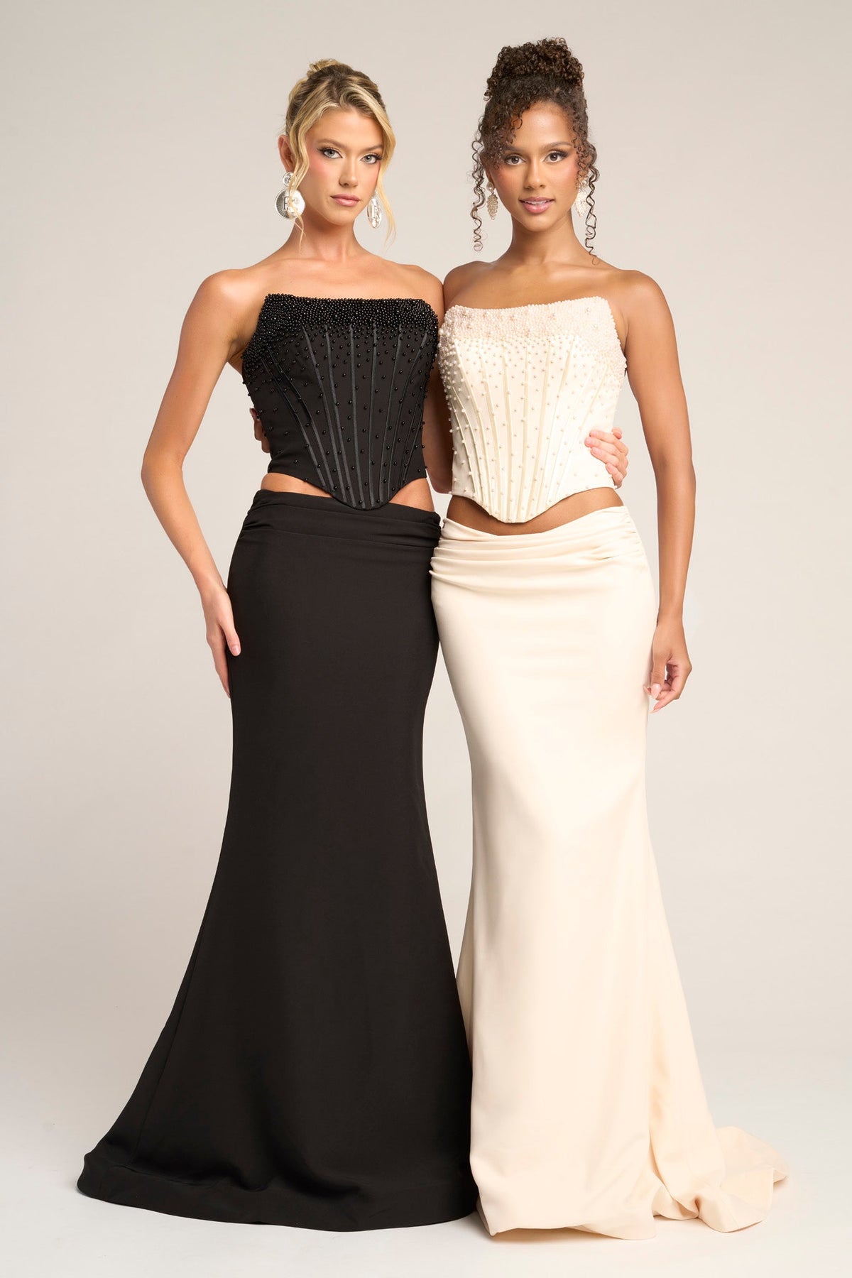 PS26007 is a two-piece gown which combines effortless sophistication with contemporary allure. The strapless corset-style bodice features delicate bead embellishments and structured boning that sculpts the figure. Paired with a floor-length skirt, the look strikes the perfect balance between structure and softness.