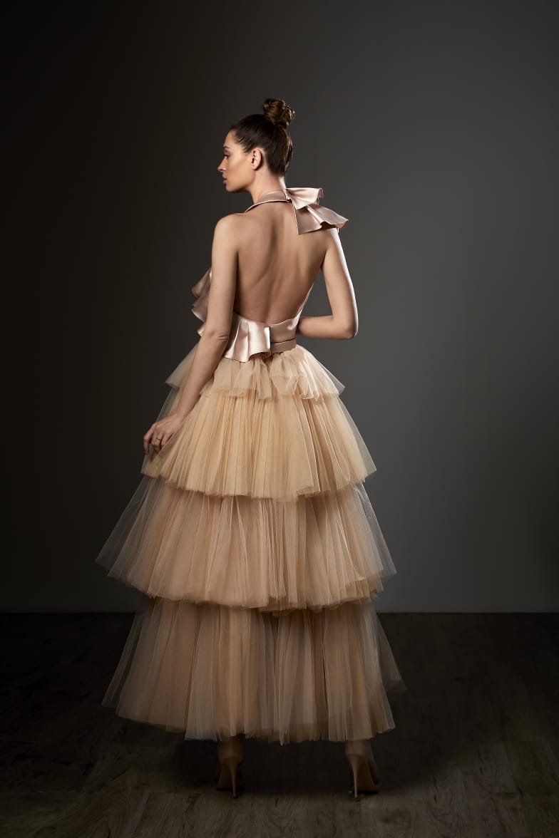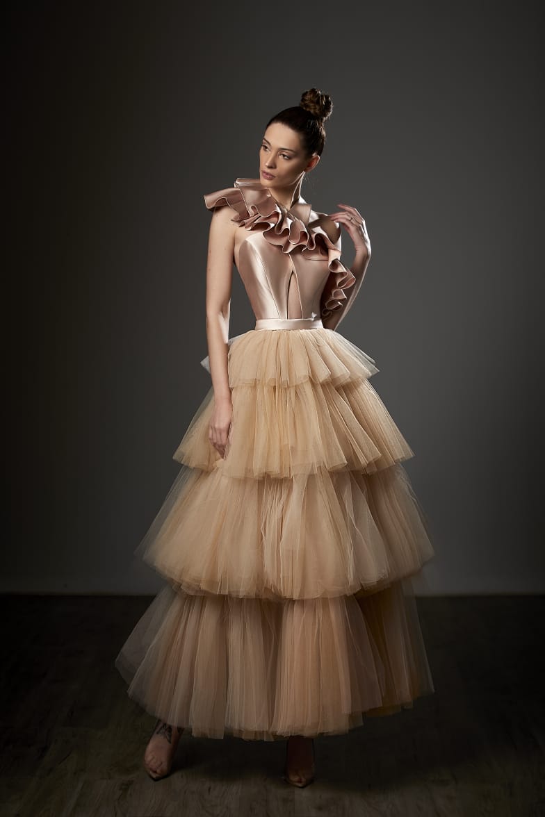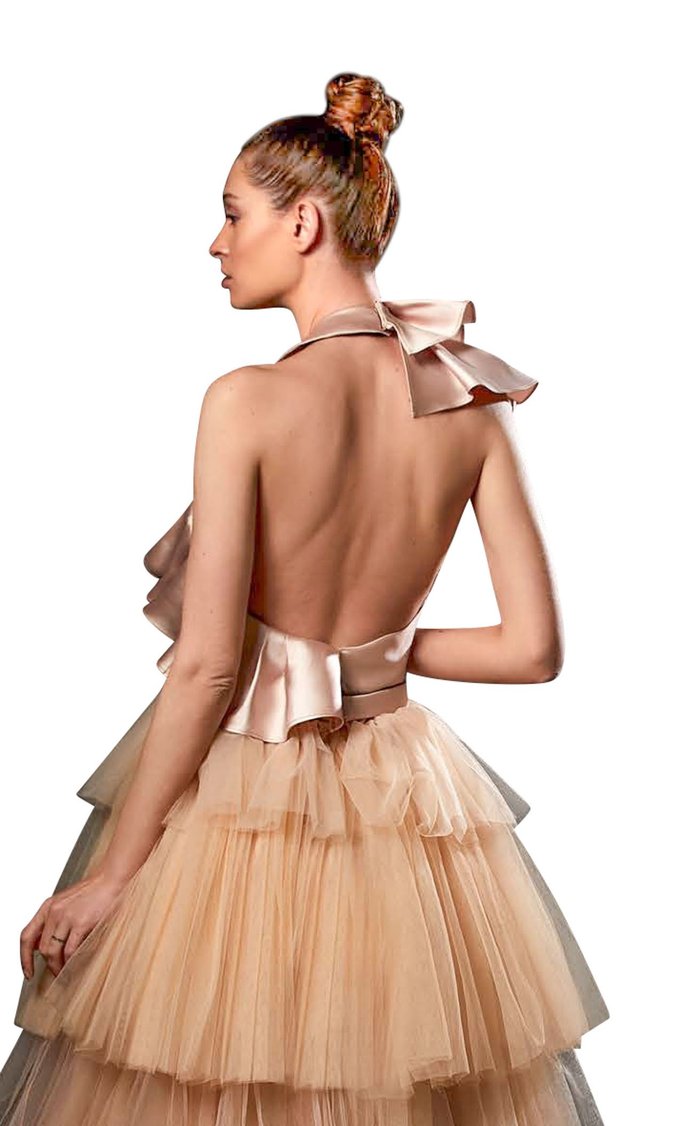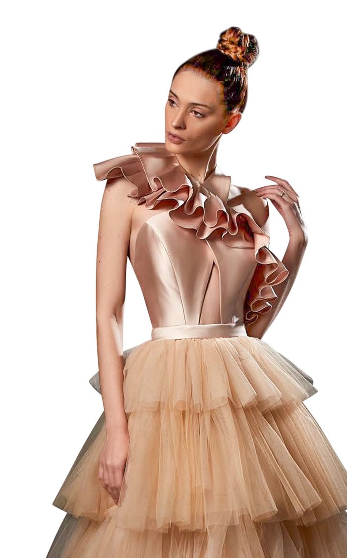 Slip into pure magic with the Ziad Germanos ZG42—a midi dress that's basically a standing ovation waiting to happen. This show-stopping number flaunts a chic one-shoulder neckline that lets your shoulders do the talking, while luxe satin and dreamy tulle layers dance together in the most flirtatious way. The A-line silhouette hugs you just right, and those cascading tiered ruffles? They're here to add serious movement and playful drama. With an open back that whispers mystery, you'll have everyone wondering what you're up to. Perfect for anyone who refuses to blend in—this dress is your ticket to turning heads and stealing the spotlight at every glamorous gathering.