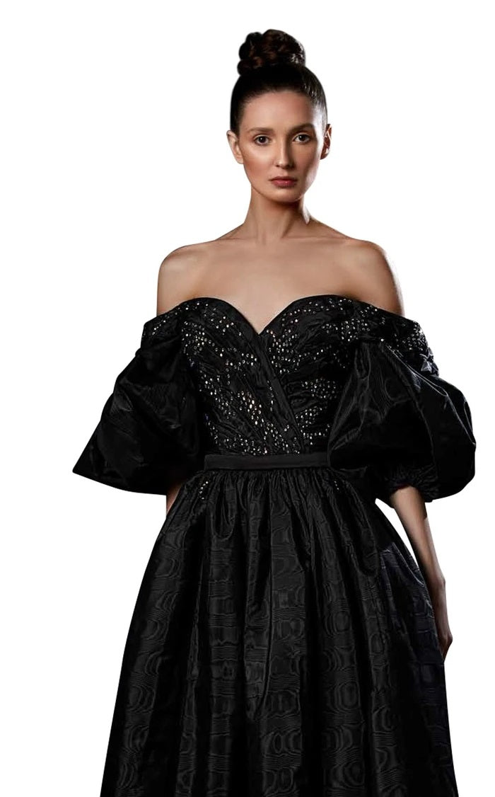 Slip into pure magic with the Ziad Germanos ZG75—where jacquard dreams meet ball gown reality. This show-stopping stunner features an off-the-shoulder sweetheart neckline, playful puff sleeves, and intricate pleating that'll have everyone asking who designed your gown. The long, flowing silhouette glides like you're walking a red carpet, while the back zipper keeps everything perfectly in place. Crafted from luxurious jacquard fabric with couture-level tailoring, this is your ticket to feeling absolutely fabulous at any special occasion. Pure elegance, pure you.