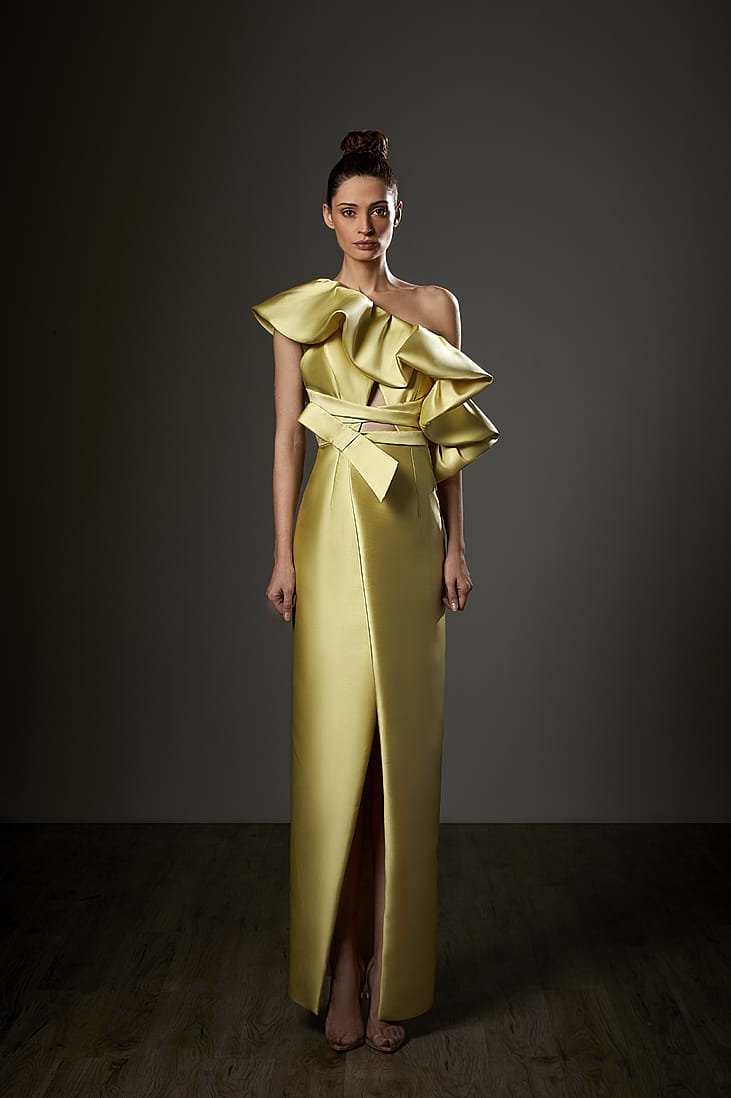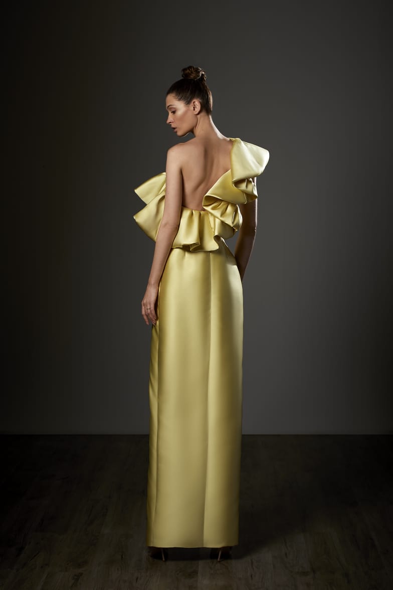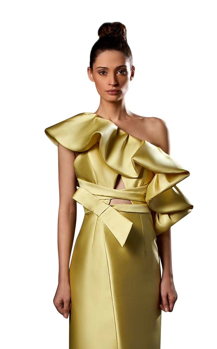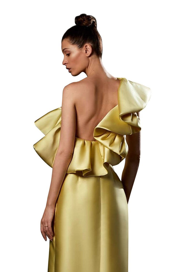 Command the room in the Ziad Germanos ZG83, where bold elegance meets playful sophistication. This stunning mikado column gown features a daring thigh-high slit that flirts with every stride, while romantic ruffle sleeves frame an alluring one-shoulder neckline. A sculptural waist bow cinches your silhouette to perfection, and cascading back ruffles add movement and drama. Designed for the woman who refuses to blend in, this evening masterpiece wraps you in luxurious texture and timeless glamour—because sometimes the best nights deserve a dress that's just as unforgettable as you are.