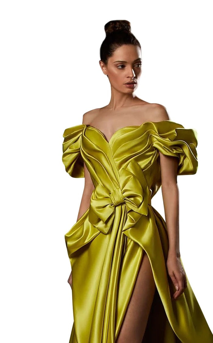 Step into pure magic with the Ziad Germanos ZG86—where timeless elegance meets playful sophistication. This luxurious mikado evening dress features a flattering fitted bodice that flows into a graceful A-line skirt with a cheeky slit for movement and allure. The romantic sweetheart neckline and charming bow accents add personality, while short sleeves keep things refined. A concealed back zipper ensures a flawless silhouette, making this couture beauty your secret weapon for turning heads at any special occasion. Because sometimes, elegance deserves a little wink.