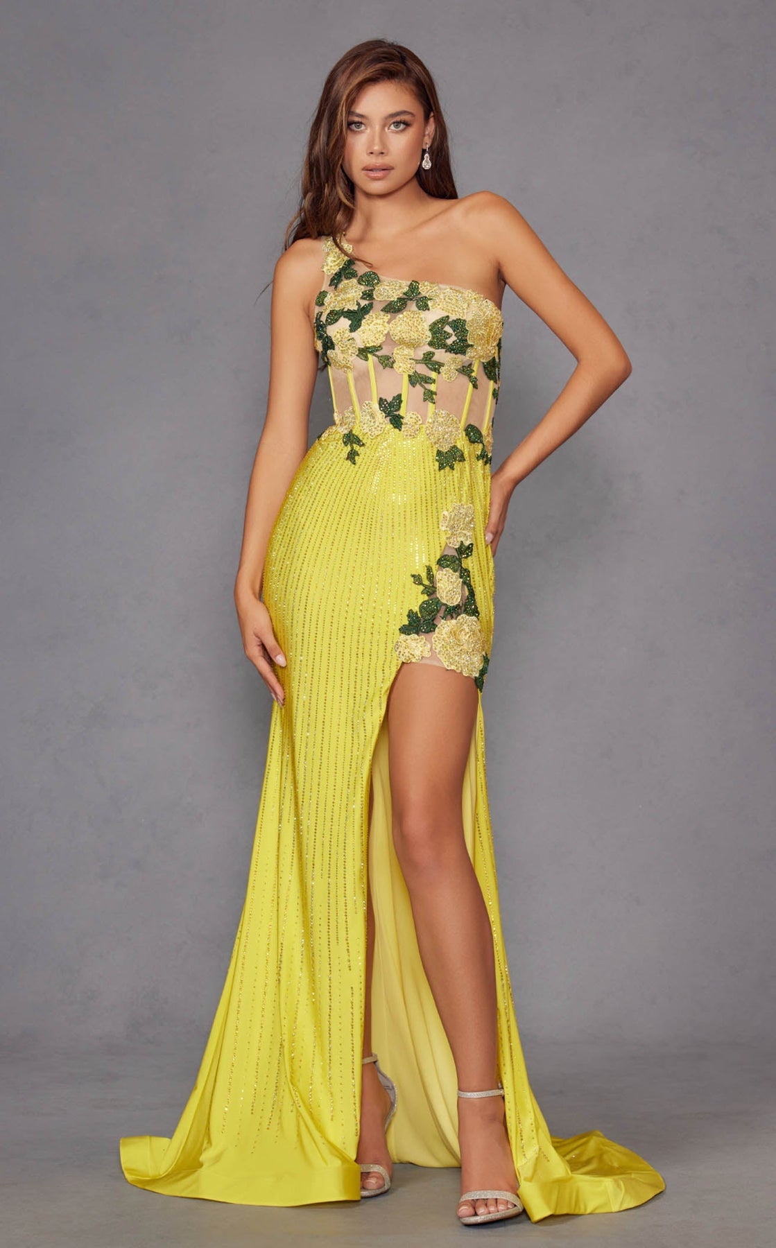 The Juliet JT2514R Dress is designed for those who embrace bold fashion statements. This striking high-low gown features a dramatic one-shoulder neckline and sculpted silhouette that creates an unforgettable silhouette. Sheer bodice panels and intricate floral embellishments blend couture sophistication with garden-inspired artistry, while a daring slit adds movement and confidence. Whether you're attending a special event or making an entrance, this dress empowers you to express your most glamorous self with style and poise.