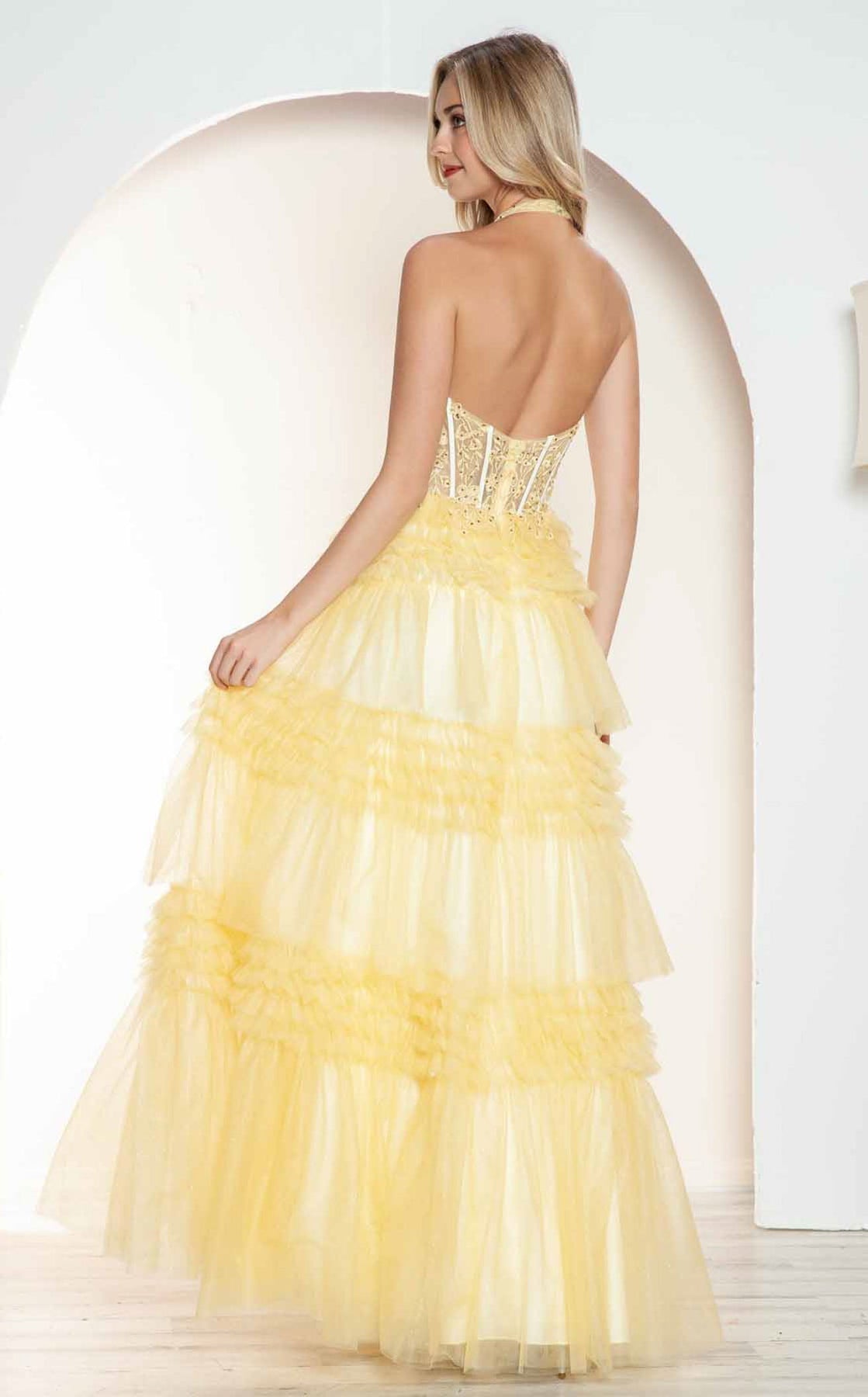 Make a statement in the Juliet JT2556S, where glamour meets movement. This show-stopping gown features a daring plunge neckline framed by a halter bodice adorned with delicate floral embroidery. Layers of shimmering glitter tulle cascade down in a tiered silhouette, while a thigh-high slit adds just the right amount of sass. Perfect for those ready to turn heads and own the room with confidence and flair.