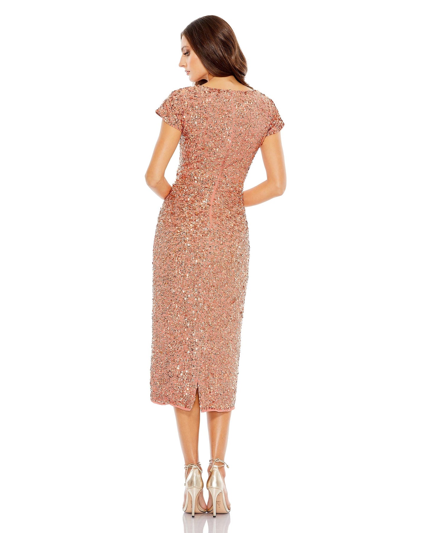 Dazzle and shine in the Mac Duggal 10766 Dress. This sequined wrap over cocktail dress adds an unexpected twist to your wardrobe. The v-neck and short sleeves provide a flattering fit, and the concealed back zipper ensures a seamless look. Available in multiple colors, this dress is perfect for any occasion.