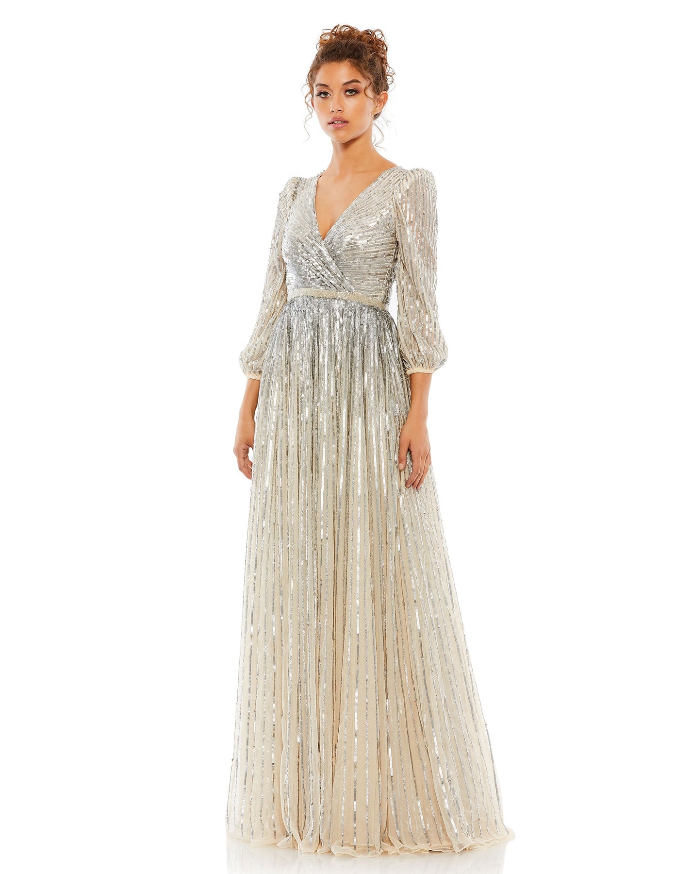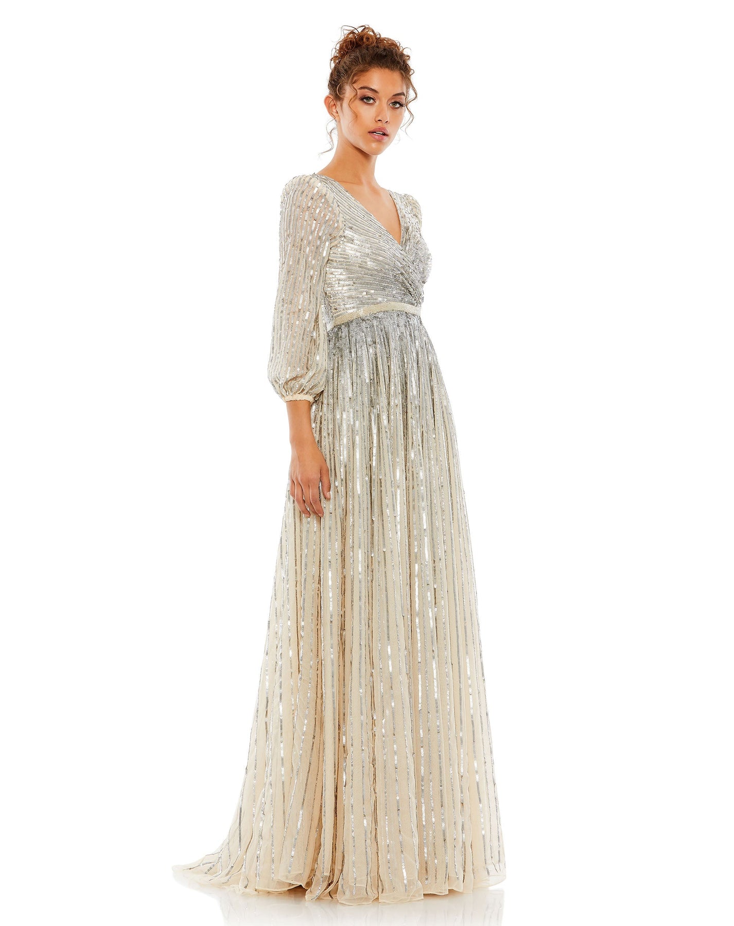 Indulge your present-day princess fantasies with this dreamy dress. Our gown is made of whisper-thin tulle with sequin stripes that appear farther apart as the skirt gets fuller. And it’s not just the embellishments that elevate this confection. The dress flaunts a surplice bodice punctuated with a beaded belt, padded shoulders, and full elbow-length sleeves.