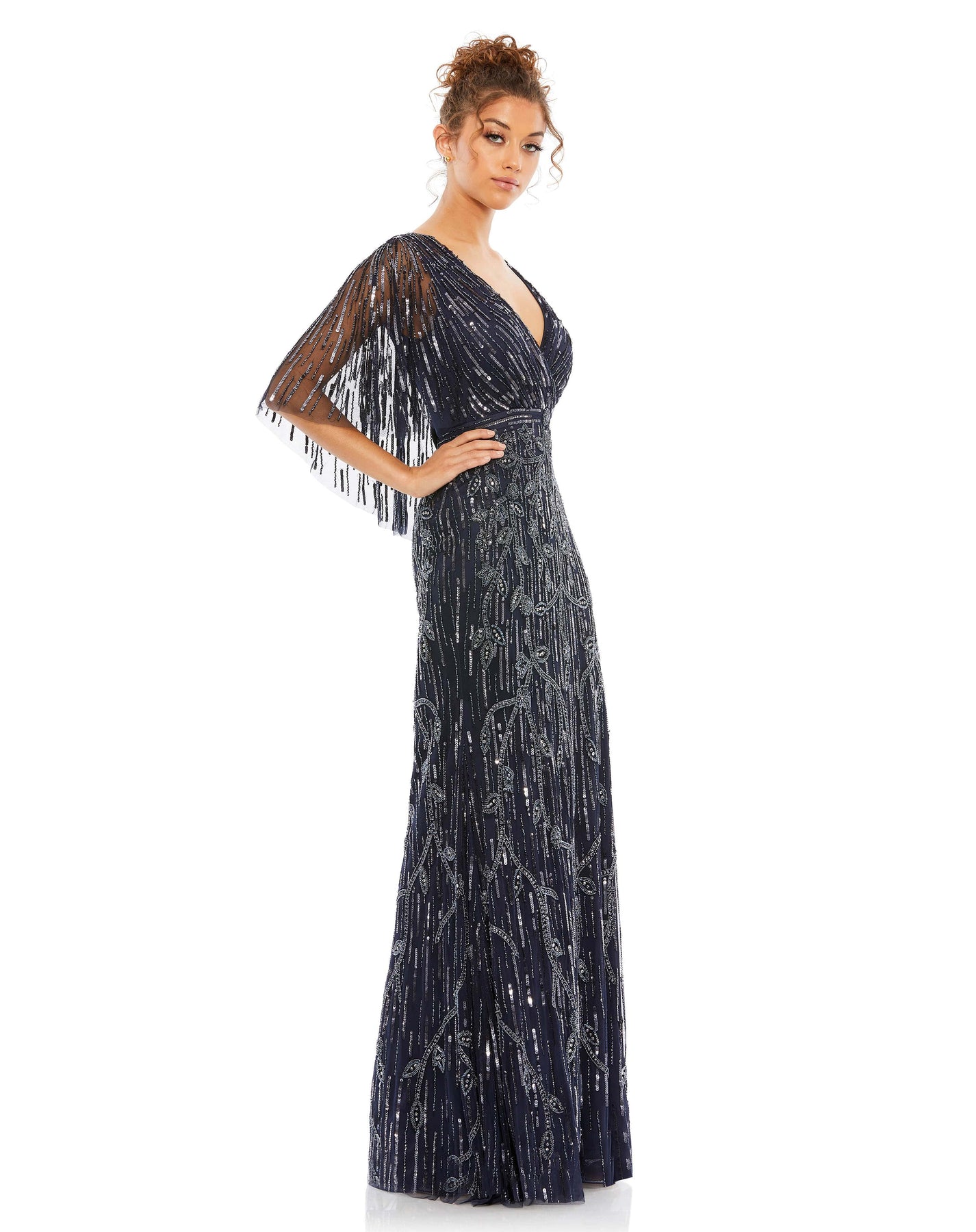 Elegant v-neck surplice evening gown adorned with sequin-and-bead floral accents throughout the mesh overlay. The sheer flutter sleeves and cape-style back feature rows of sequined embellishment.