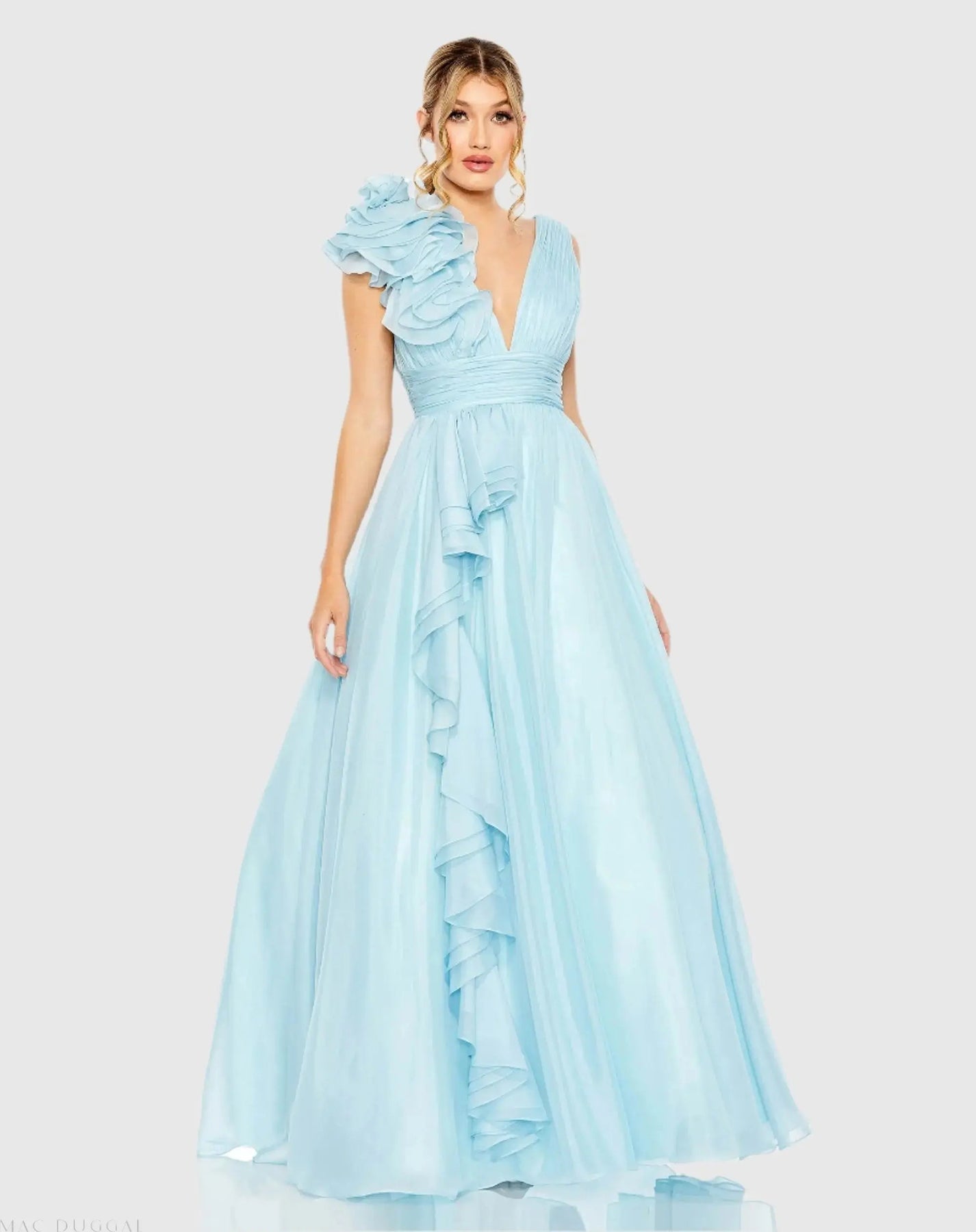 V-neck sleeveless ball gown with ruffled shoulder ruched empire waist and ruffles flowing down the skirt.