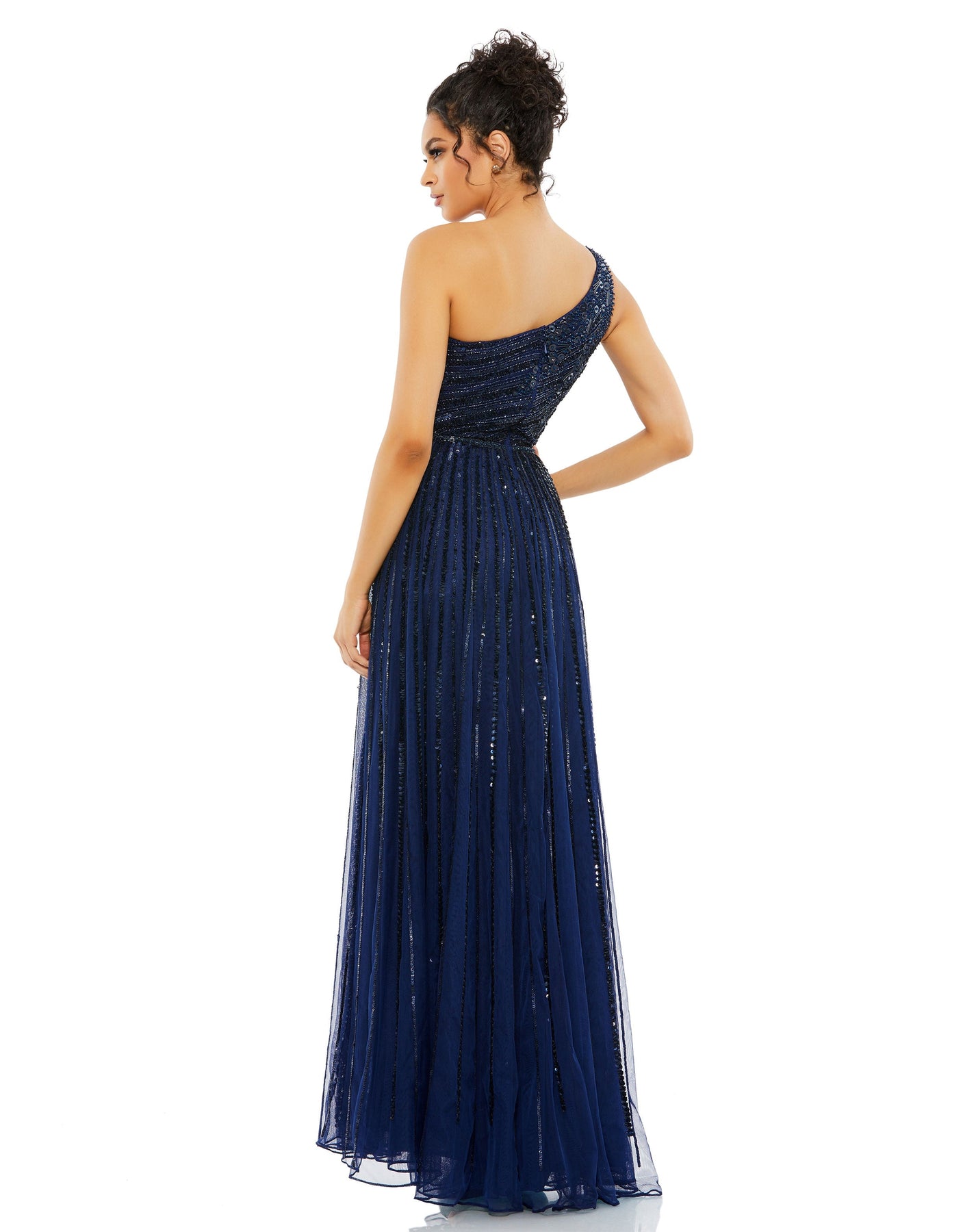 This stunning one-shoulder A-line gown is embellished with cascading diagonal rows of sequins and beads throughout the mesh overlay. The focal point of this gown is the beautiful bead work that lays at the top of the bodice. This gown also features a small sweeping train, and a dainty hand-beaded belt sits at the natural waist.