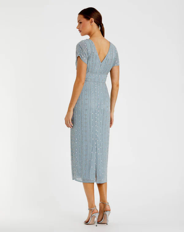Turn heads at summer outdoor weddings and cocktail events in our Beaded Cap Sleeve Sheath Dress. With intricate embellishments, it exudes effortless elegance and seasonal charm.