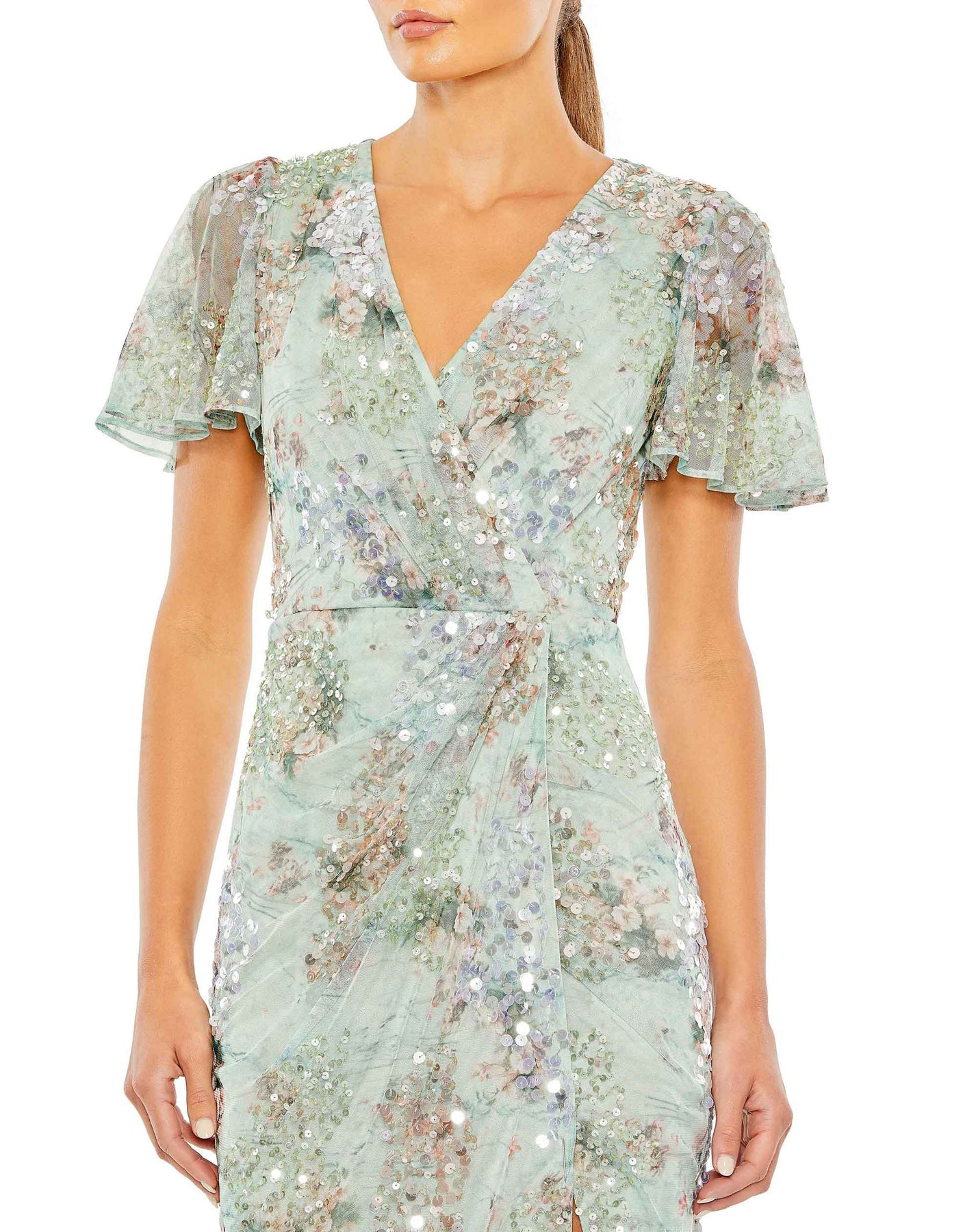Our Embellished Butterfly Sleeve Faux Wrap Gown embodies timeless elegance and grace. Crafted with a hand-embellished floral mesh overlay and fully lined bodice and skirt, it exudes sophistication. Featuring a flattering V-neckline, delicate short butterfly sleeves, and a faux wrap bodice, it offers timeless charm for any special occasion. Complete with a thigh-high front slit, it ensures you make a stunning entrance wherever you go.