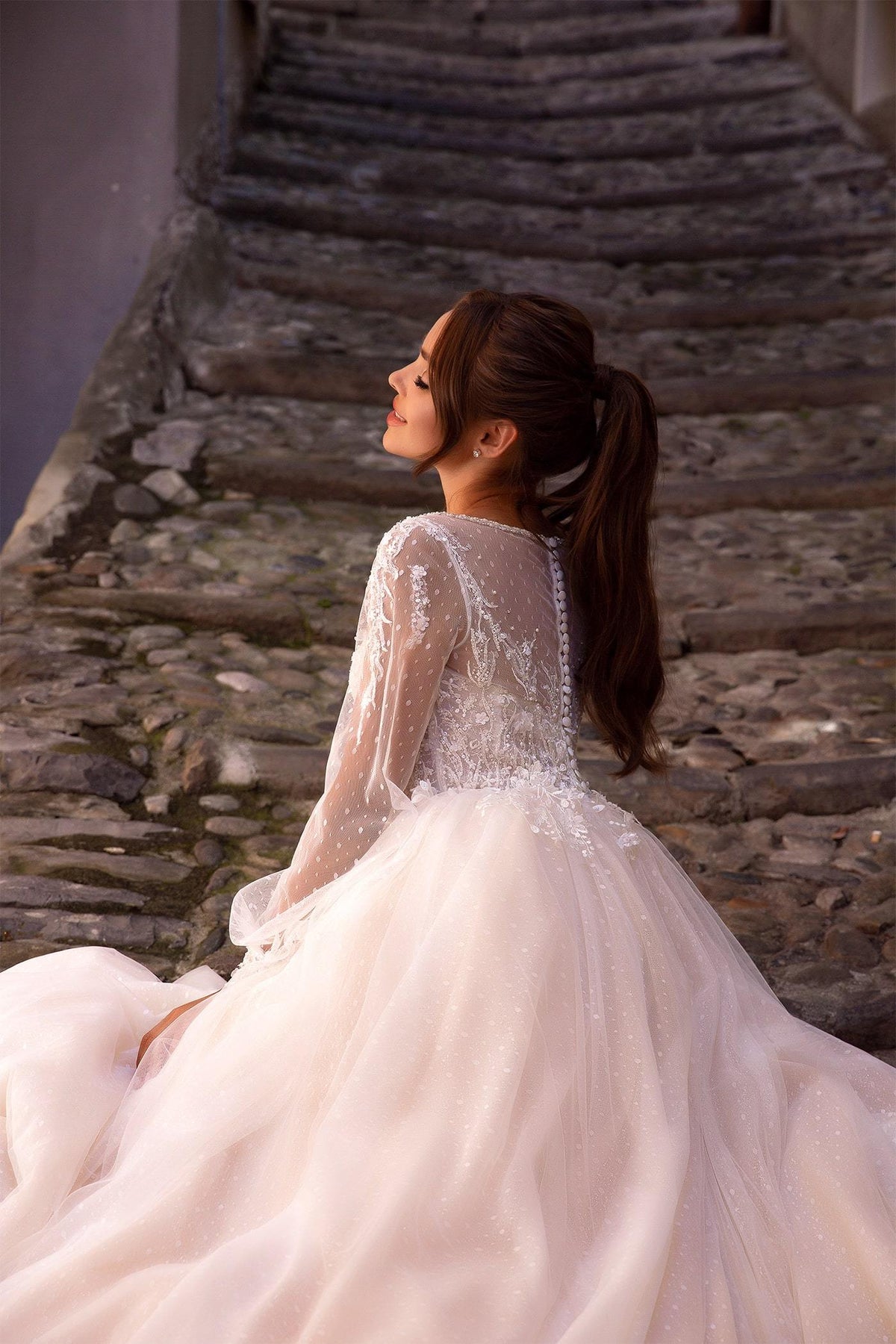 This Maria Anette 5038 long dress is a beautiful choice for any bride. With elegant sleeves and a v neckline, it offers a sophisticated and timeless look. Perfect for any wedding, this dress will make you feel confident and stunning on your special day.
