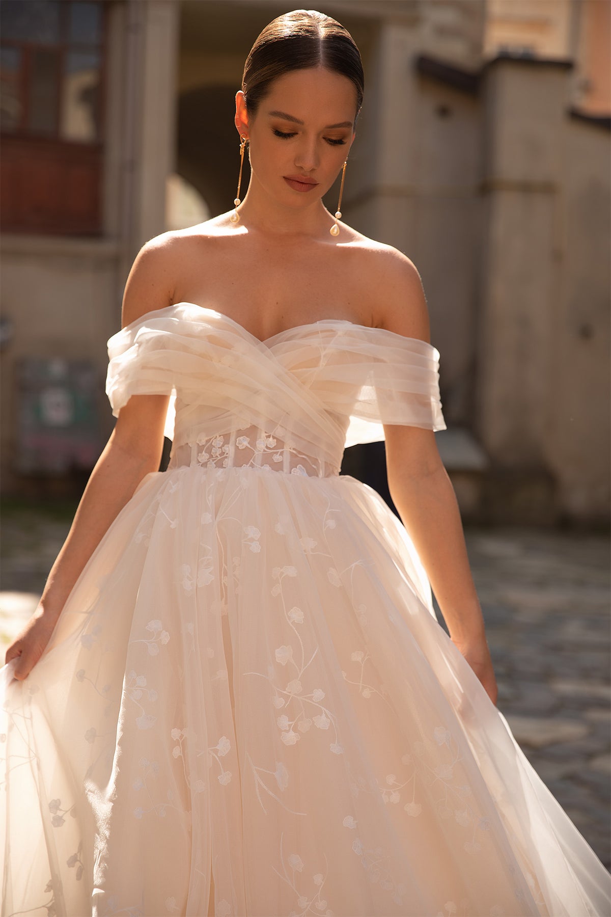 The Maria Anette 5310 Dress is a daring bridal gown featuring a romantic sweetheart neckline and off-shoulder puff bishop sleeves. Adorned with intricate floral appliqués and an open back, this dress combines bold elegance with a touch of whimsy, perfect for a bride who wants to make a striking statement.