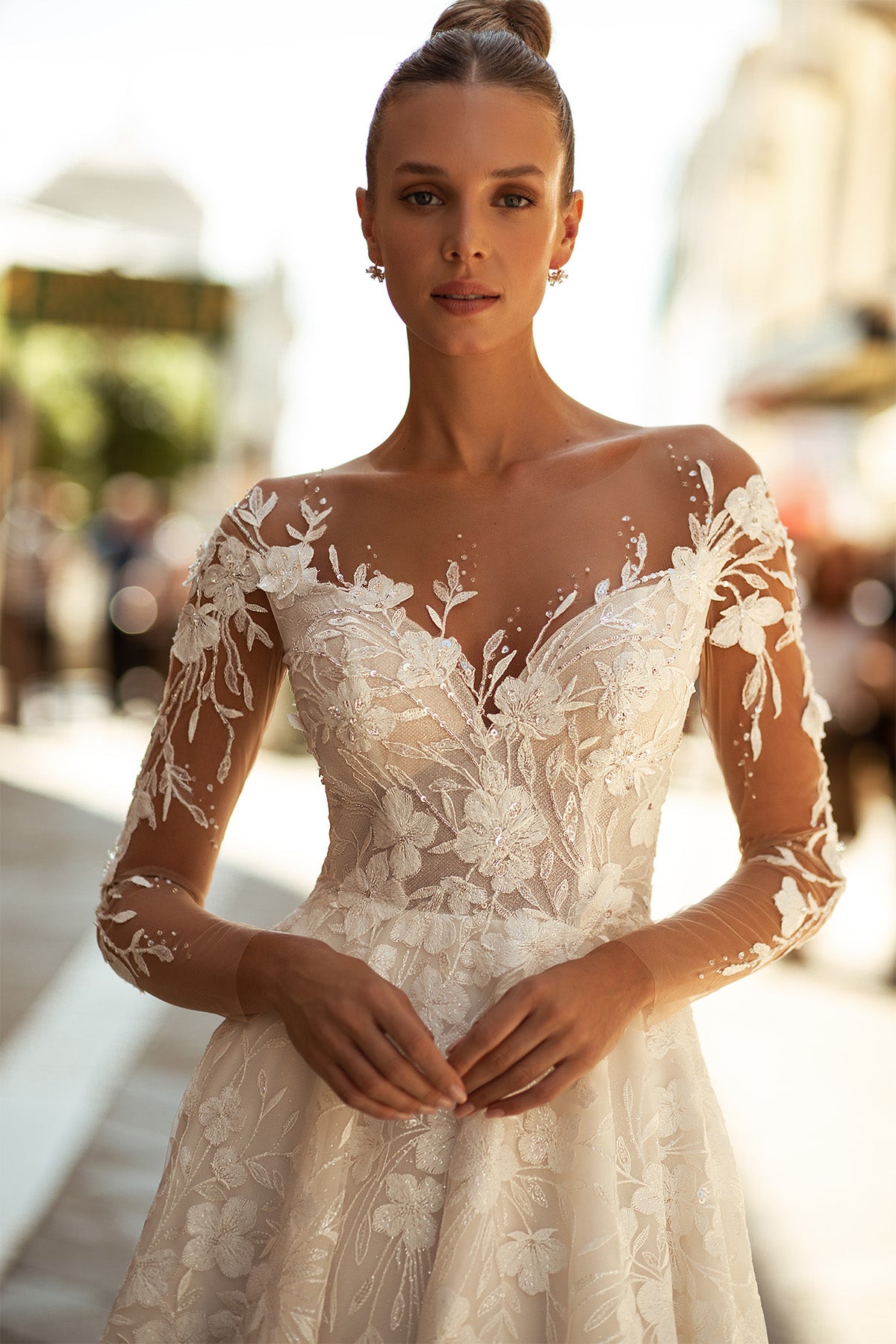 The MARIA ANETTE 5405 Dress is a daring bridal gown that commands attention. Featuring a striking V neckline and long sheer sleeves adorned with delicate floral appliqués, this long gown blends bold design with intricate detailing. Perfect for the bride who wants to stand out with elegance and fearless style.