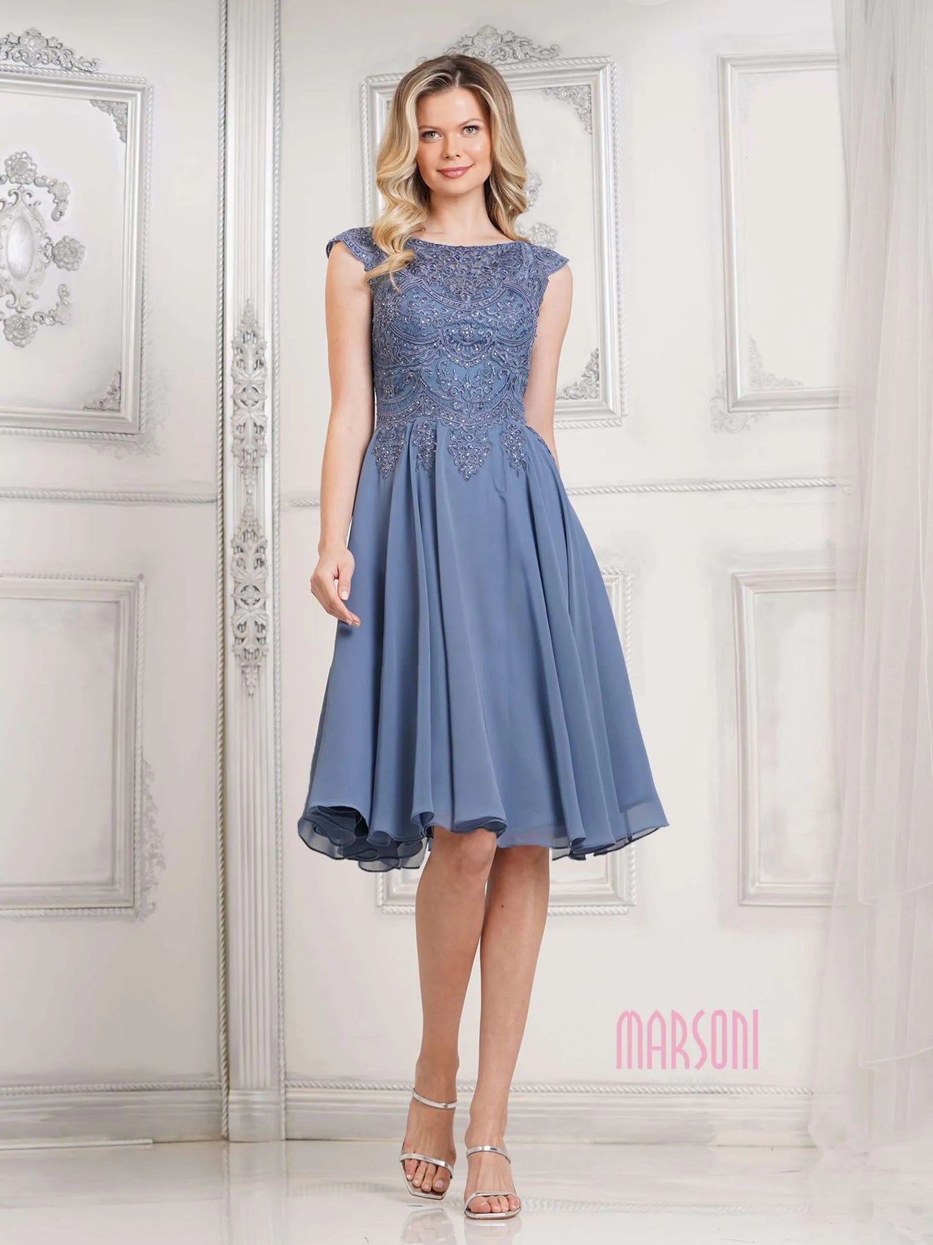 Unleash your inner fashionista with the MARSONI BY COLORS M238S Dress! This chiffon A line short dress features a beautifully embroidered bodice and playful cap sleeves. Perfect for any occasion, this dress will have you looking and feeling stylish and chic. (No sleeves, no problem.)