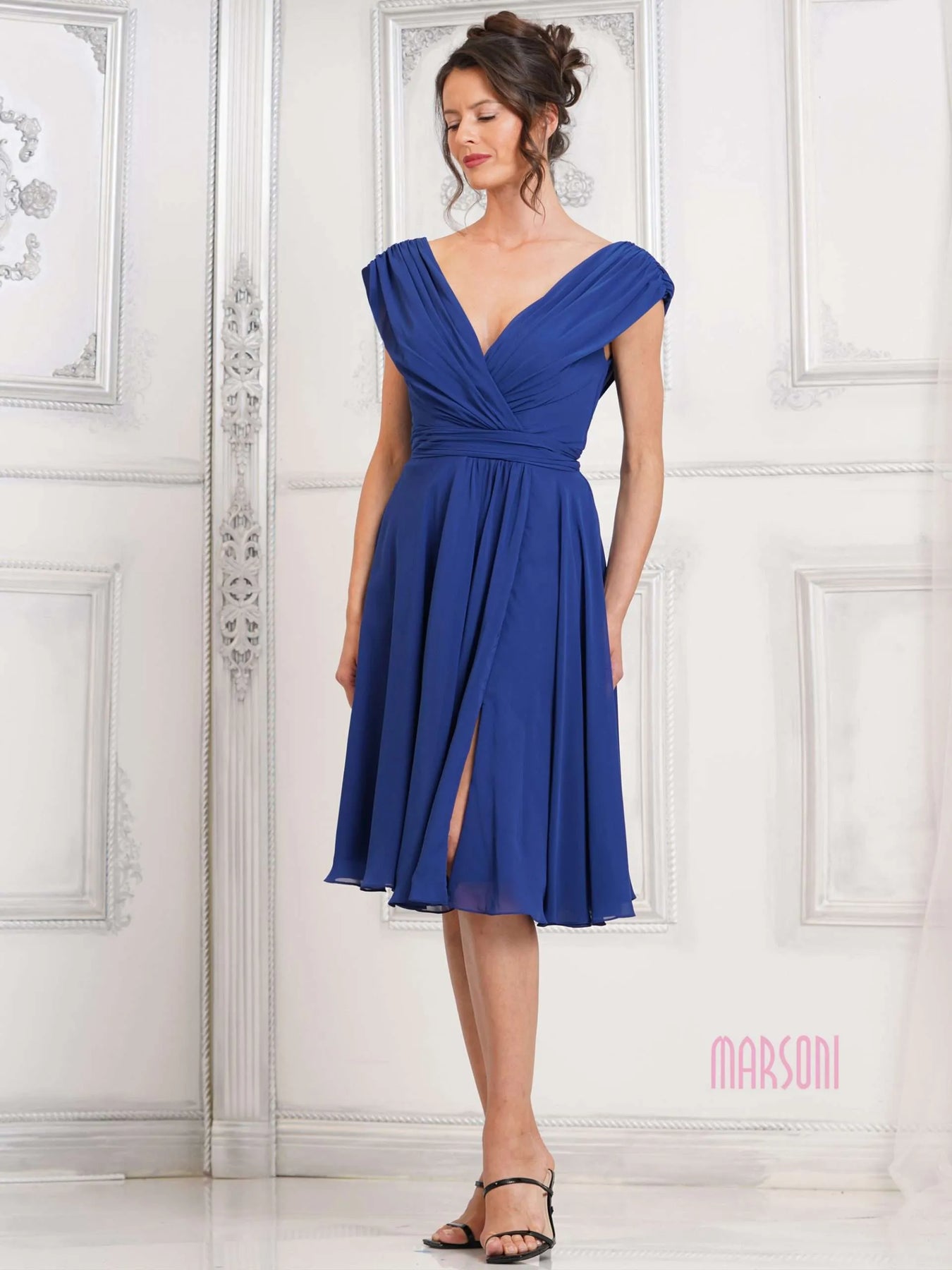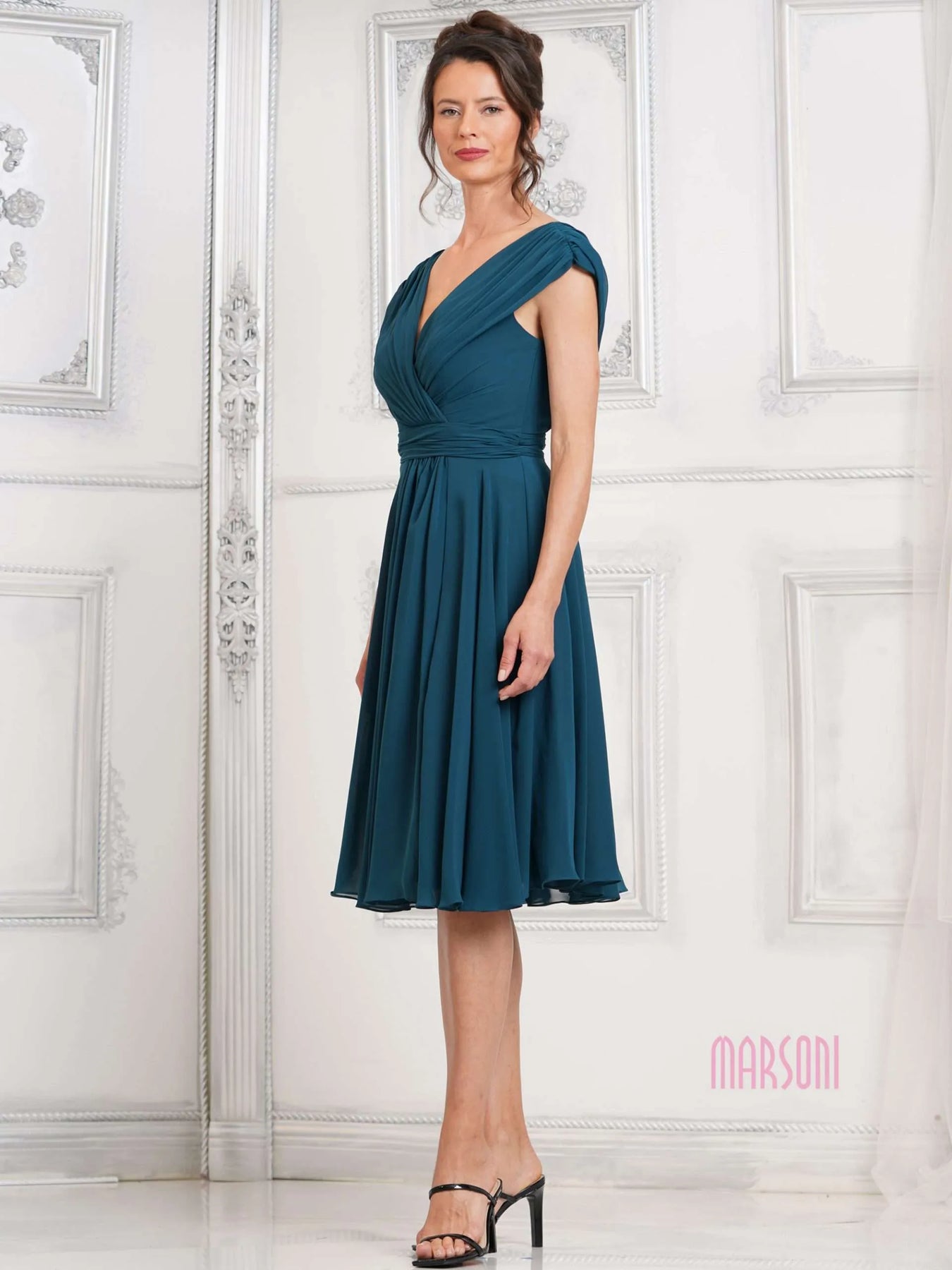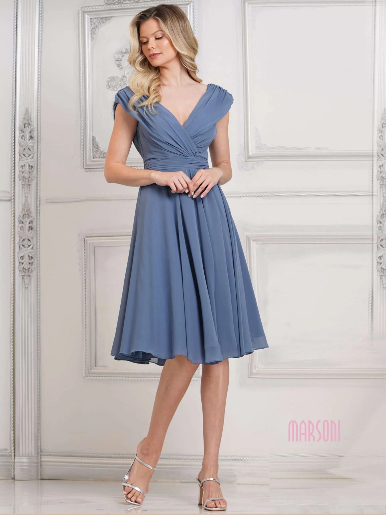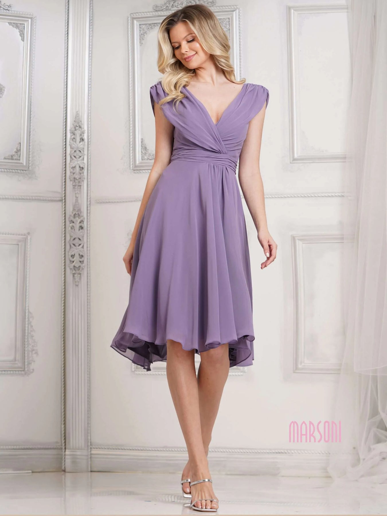 Turn heads in this playful MARSONI BY COLORS M251S Dress! With an A line chiffon design, ruched bodice, and waist band, this dress is effortlessly chic. Perfect for any occasion, this dress will have you feeling confident and stylish. Say hello to your new go-to dress!